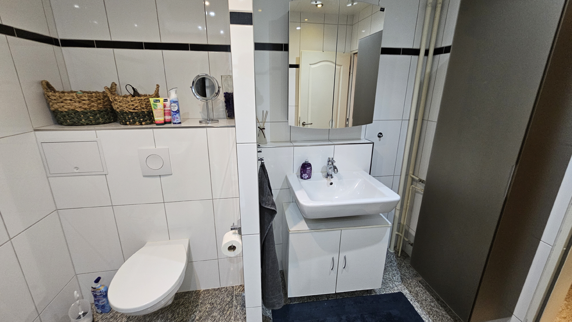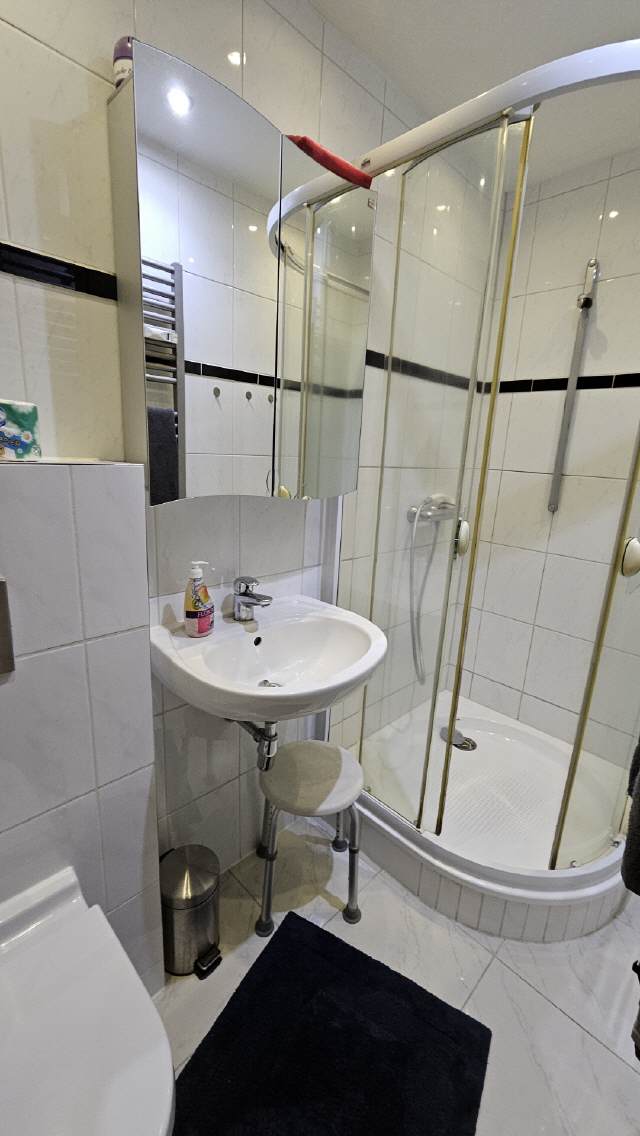 Das Badezimmer 2 verfügt über eine Dusche, sowie ein WC und ein großes Waschbecken. Auch ein kleiner Satz Handtücher ist vorhanden.