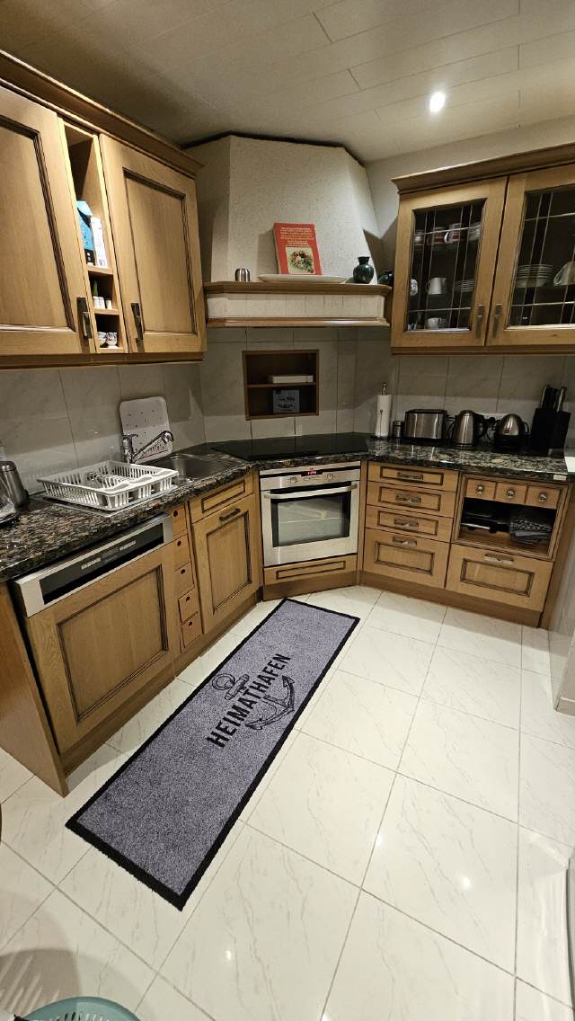 Die sehr geräumige Küche ist vollständig eingerichtet. Ein kleiner Tisch mit zwei Stühlen ist vorhanden. Selbstverständlich gehören ein Toaster, eine Kaffemaschine, eine Spüle, zwei große Kühlschränke, ein Geschirrspüler, ein Elektroherd und ein Mikrowellenherd dazu. Spül- und Geschirrtücher sind ebenfalls vorhanden.