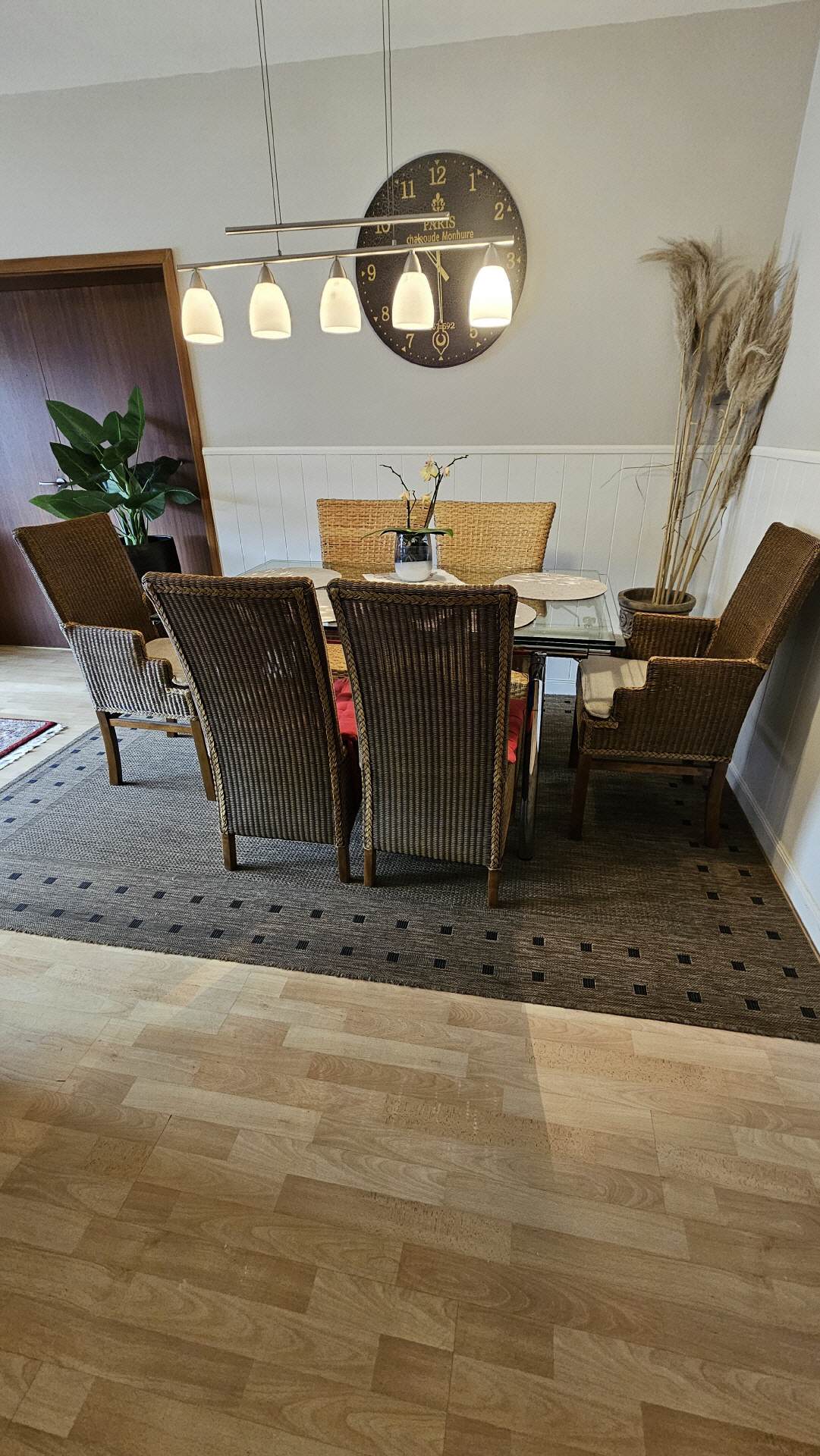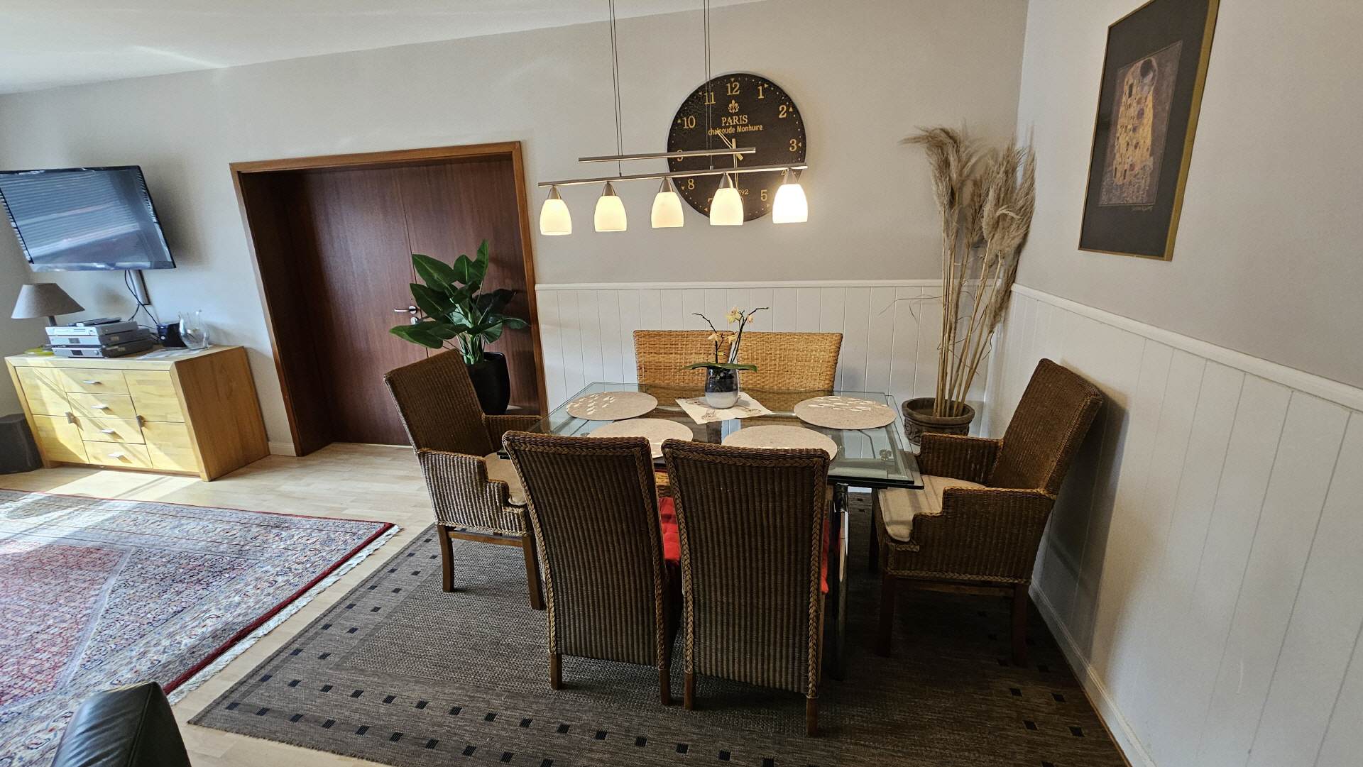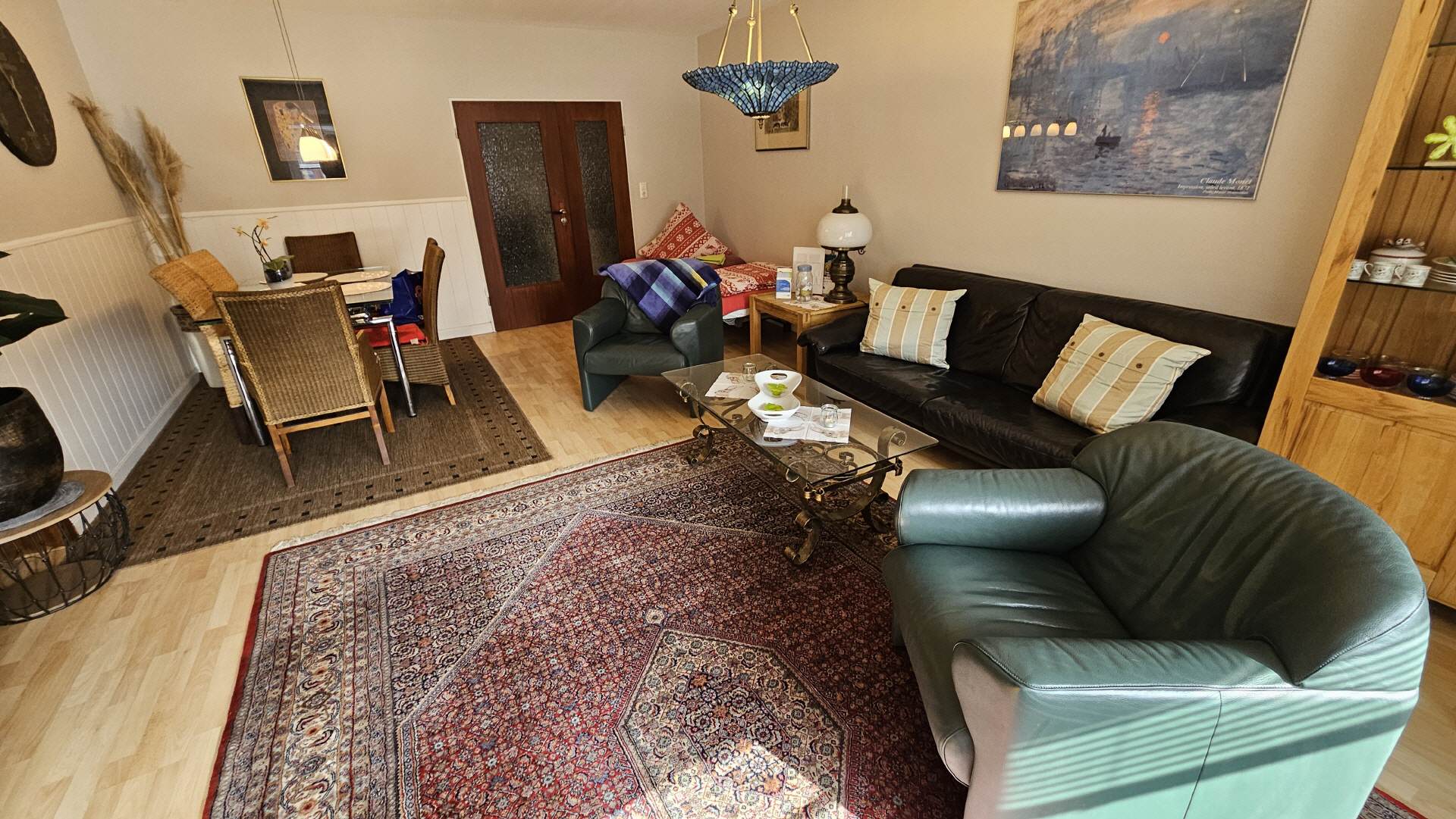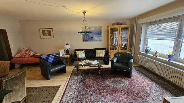 Das Wohnzimmer bzw. der Aufenthaltsraum ist etwa 30 qm groß. Hier befindet sich eine gemütliche Sofa-Sitzecke sowie ein Esstisch mit sechs Stühlen. Für Ihre Unterhaltung sorgt ein großer LCD-Fernseher und eine Stereoanlage und ein DVD-Player.