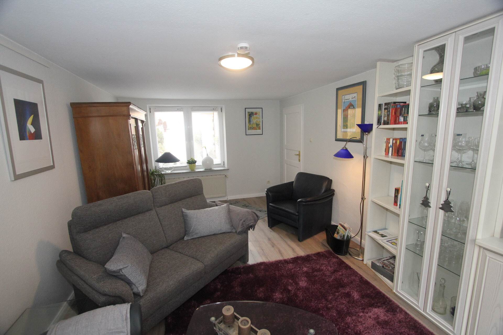 Das Wohnzimmer ist etwa 20 qm groß. Hier findet sich eine gemütliche Sofa-Sitzecke sowie ein weiteres Sofa. Ein Schrank mit LCD-Fernseher und eine kleine Auswahl an Büchern sowie eine Stereo-Anlage mit Blue-Ray-Player komplettiert die Ausstattung.