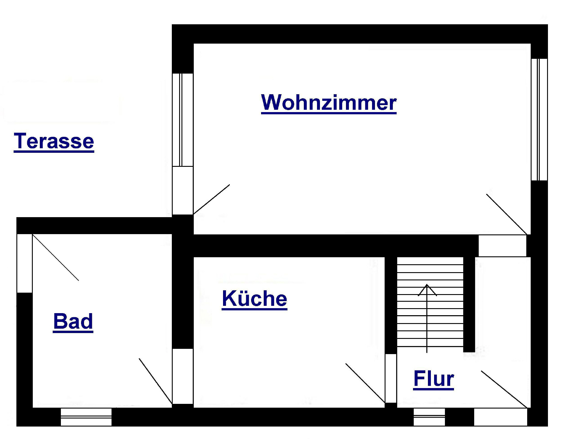 Die Grundrisse des Ferienhauses vom Erd- und Dachgeschoss zeigen die optimale Aufteilung. Unten im Ferienhaus befindet sich Duschbad, Küche, Flur mit Treppe in das Obergeschoss sowie das Wohnzimmer mi Ausgang zur Terrasse.