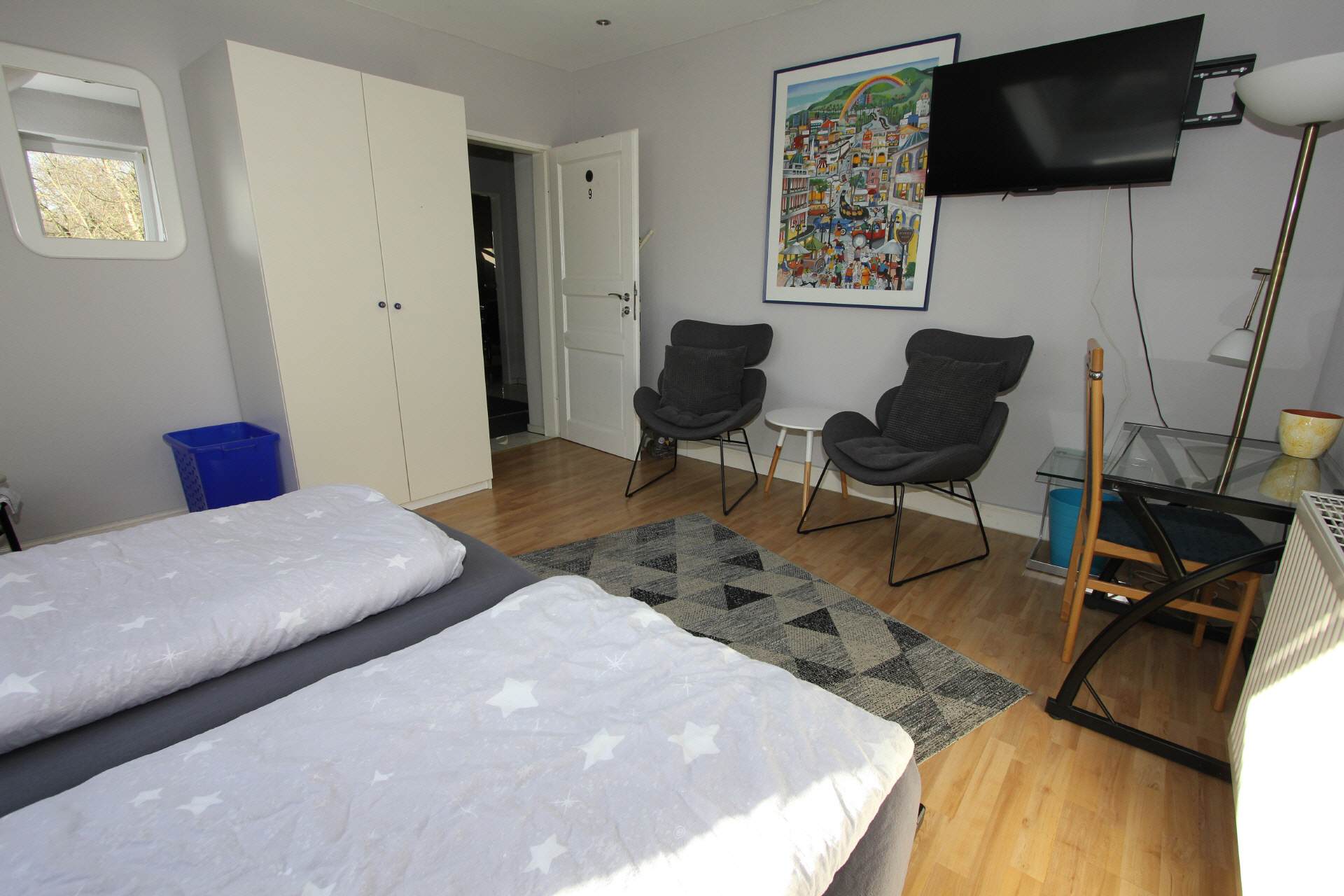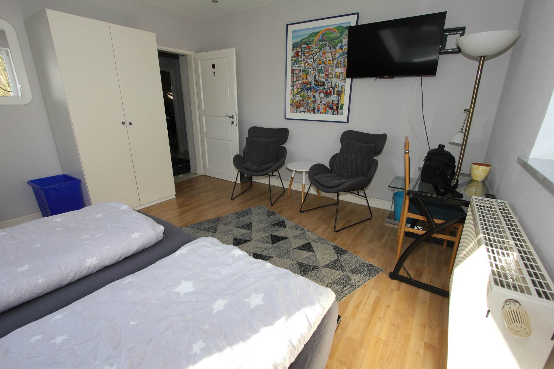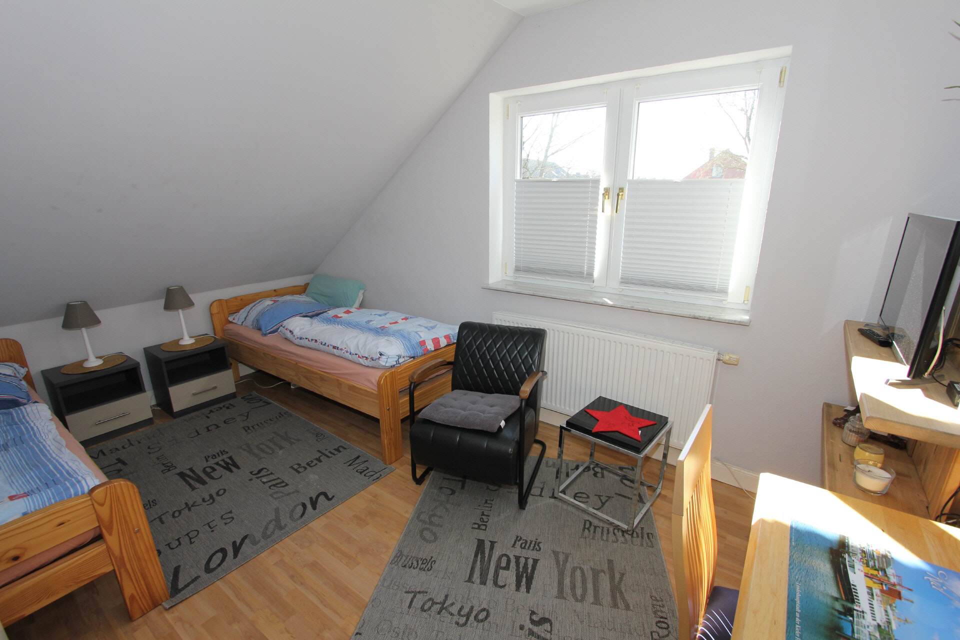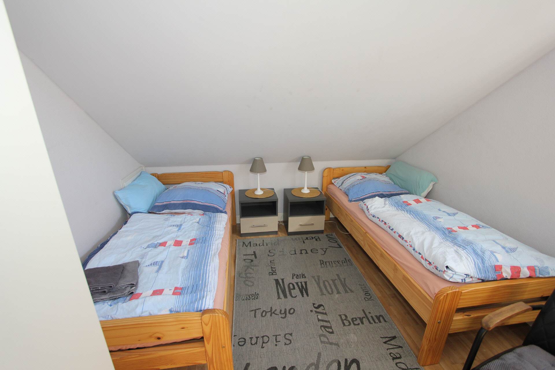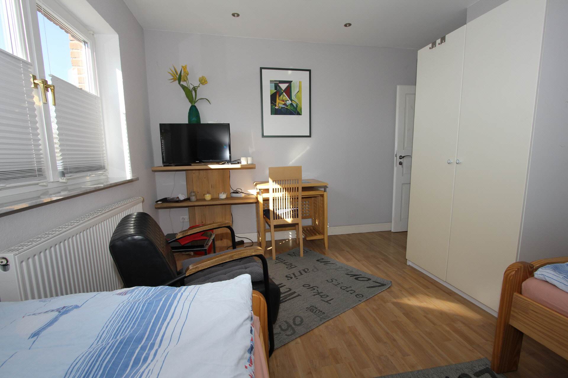 In den drei gemütlichen Schlafzimmern befinden sich jeweils zwei Betten mit Nachttischen, sowie ein Kleiderschrank mit ausreichend Platz für Ihr Reisegepäck. Weiterhin ist eine Sitzgelegenheit und ein Tisch mit Stuhl vorhanden. Ein Fernseher steht in jedem Schlafzimmer zur Verfügung.