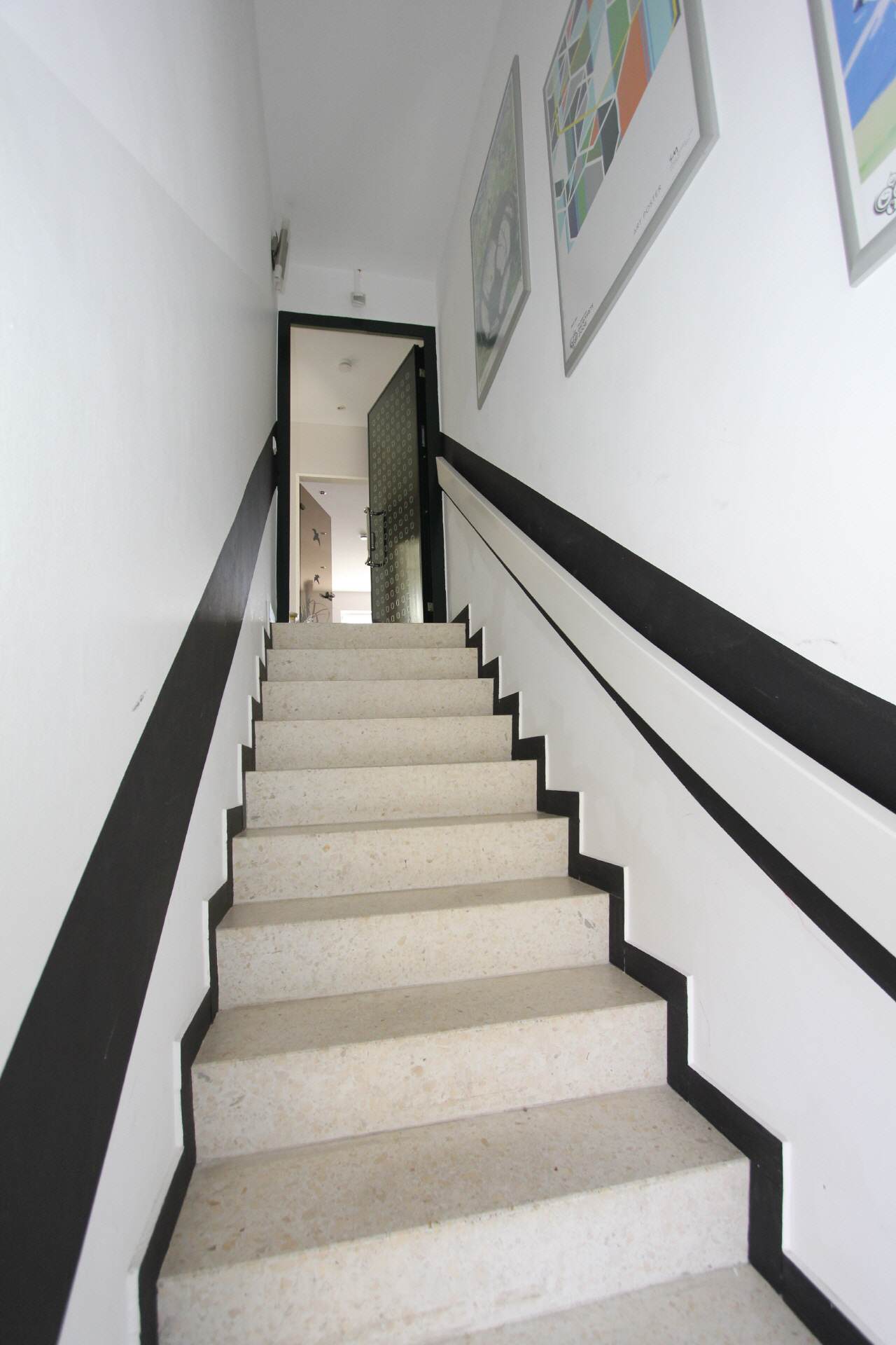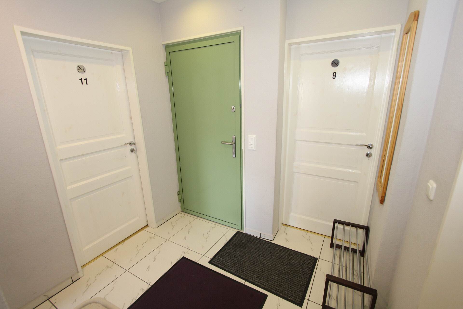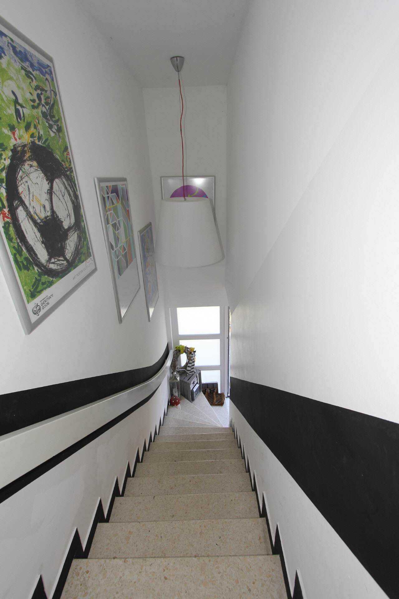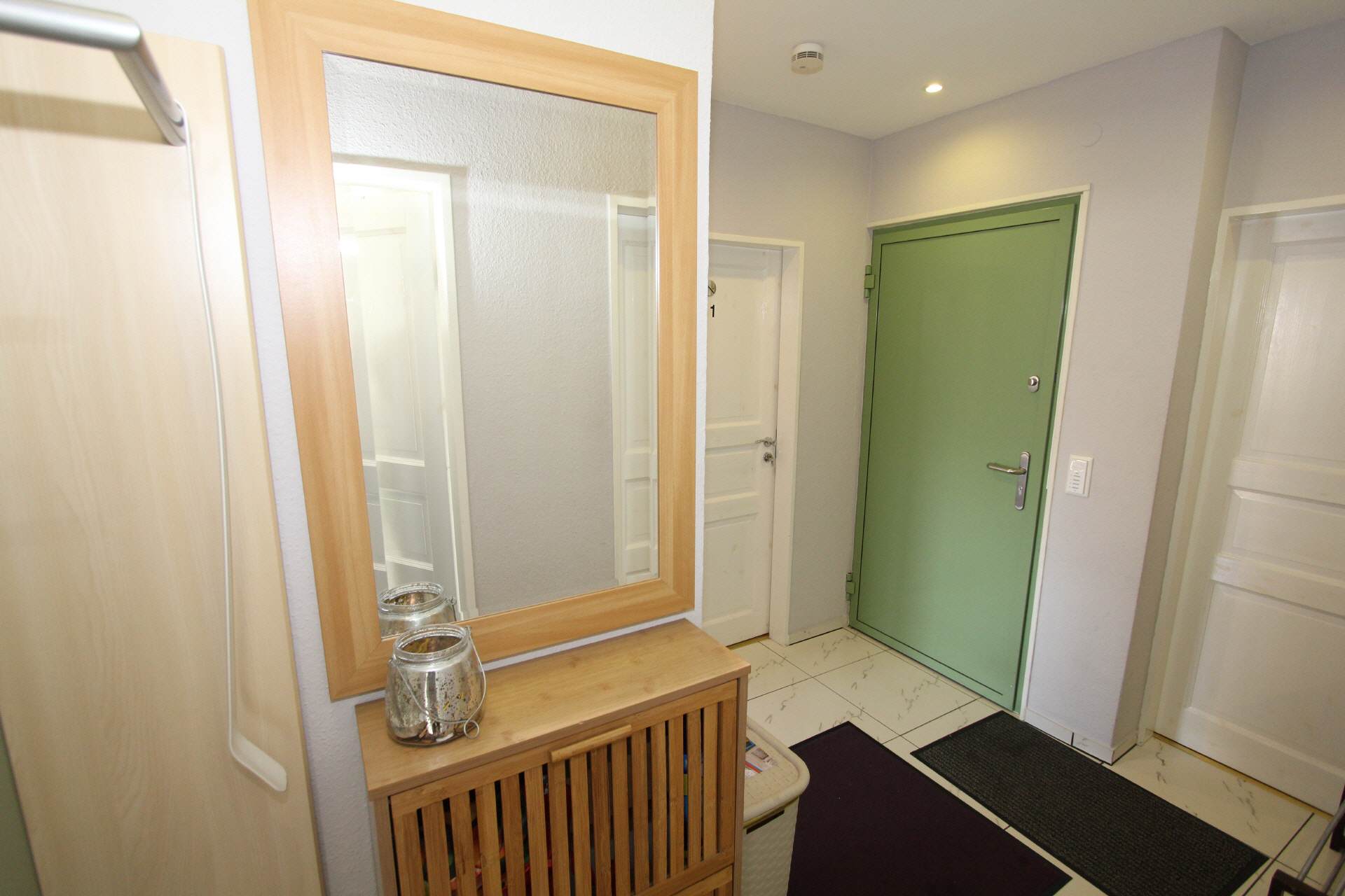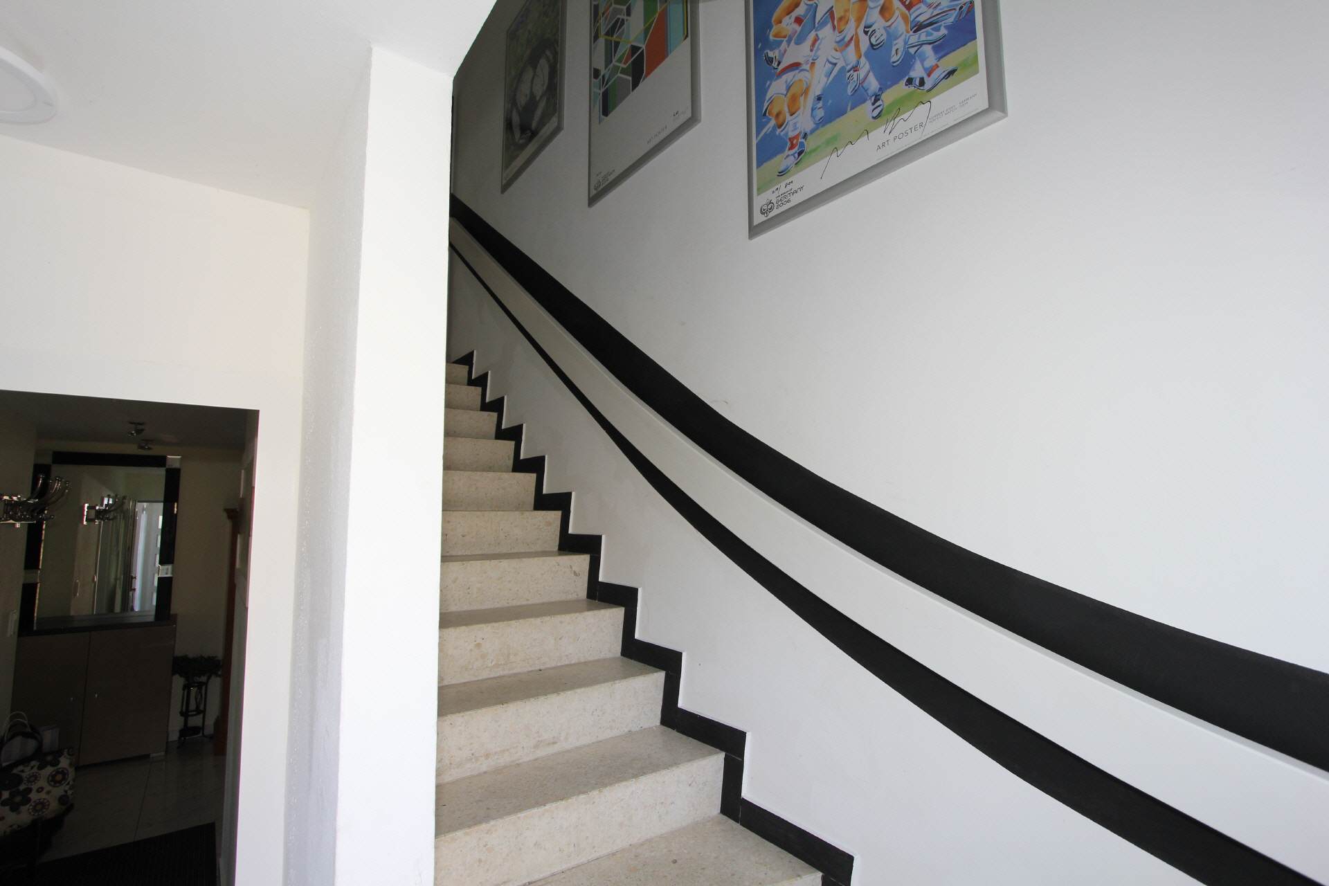 Im Flur befindet sich eine Gaderobe. Das Treppenhaus ist mit hochwertigen Drucken dekoriert.