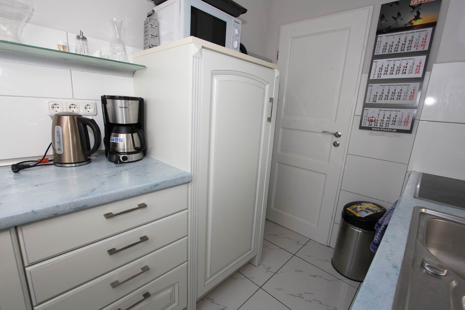 Die Küche ist vollständig eingerichtet. Dazu gehören selbstverständlich ein Toaster, eine Kaffemaschine, eine Spüle, ein großer Kühlschrank, ein Geschirrspüler, ein Elektroherd und ein Mikrowellenherd. Spül- und Geschirrtücher sind ebenfalls vorhanden.