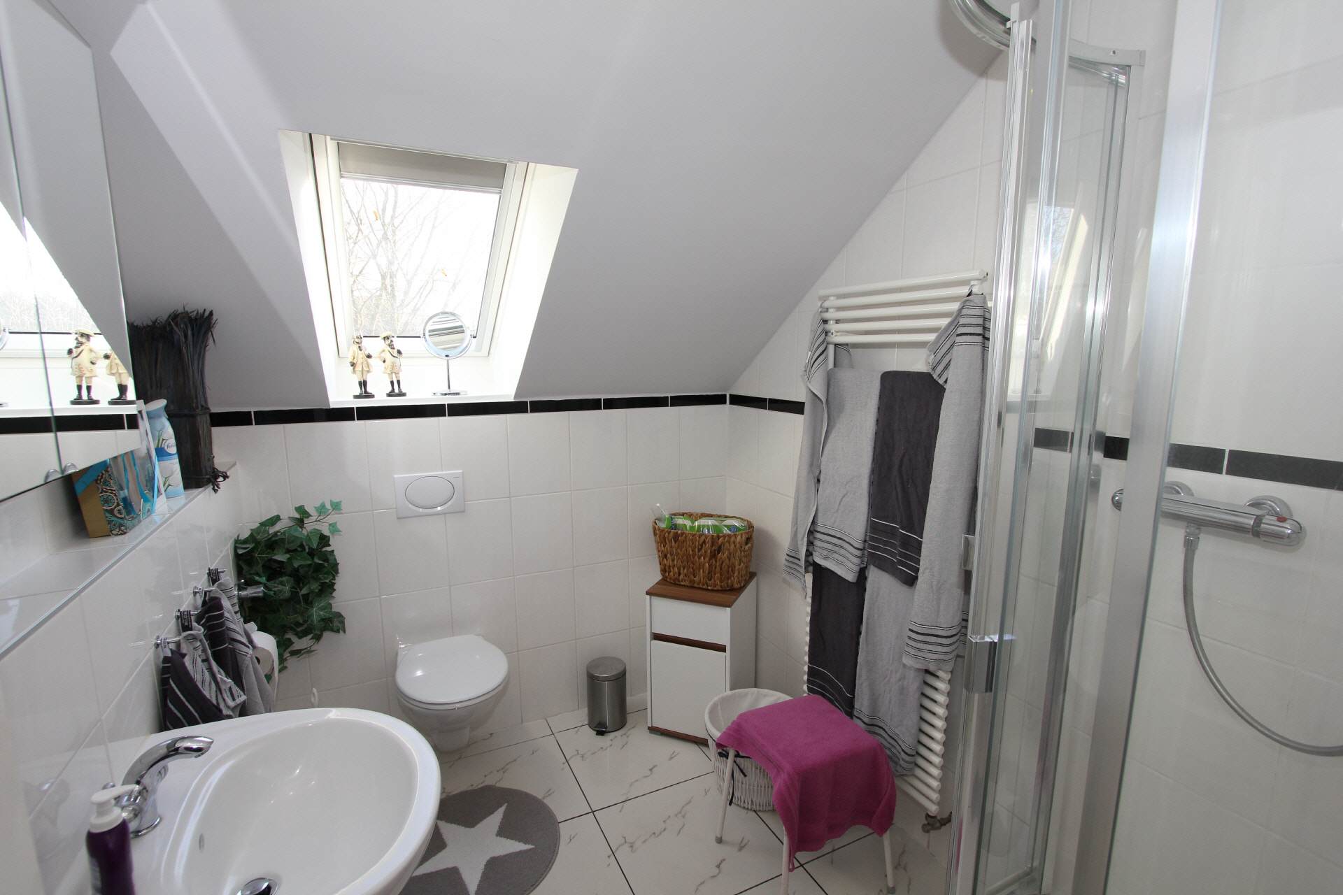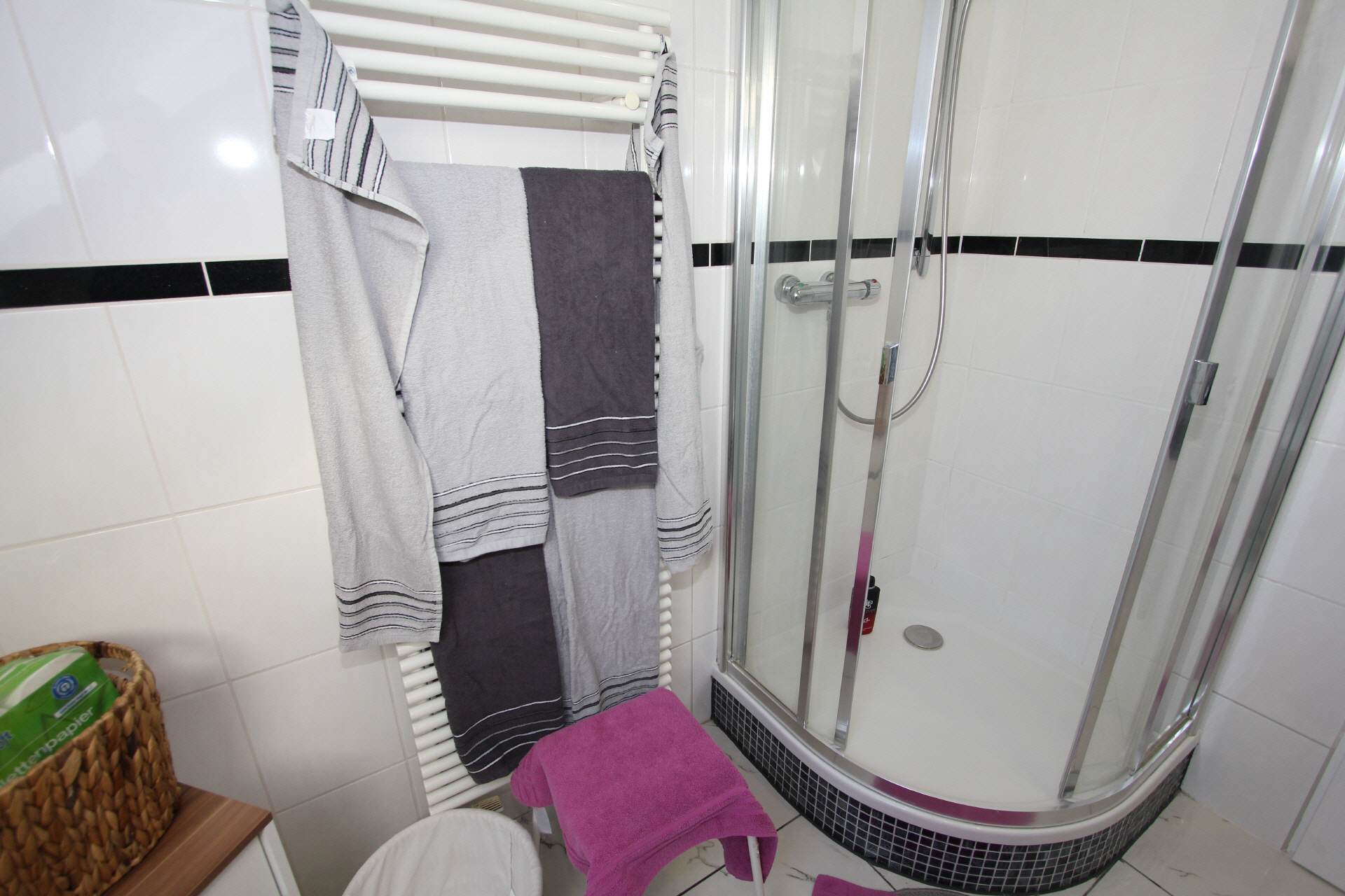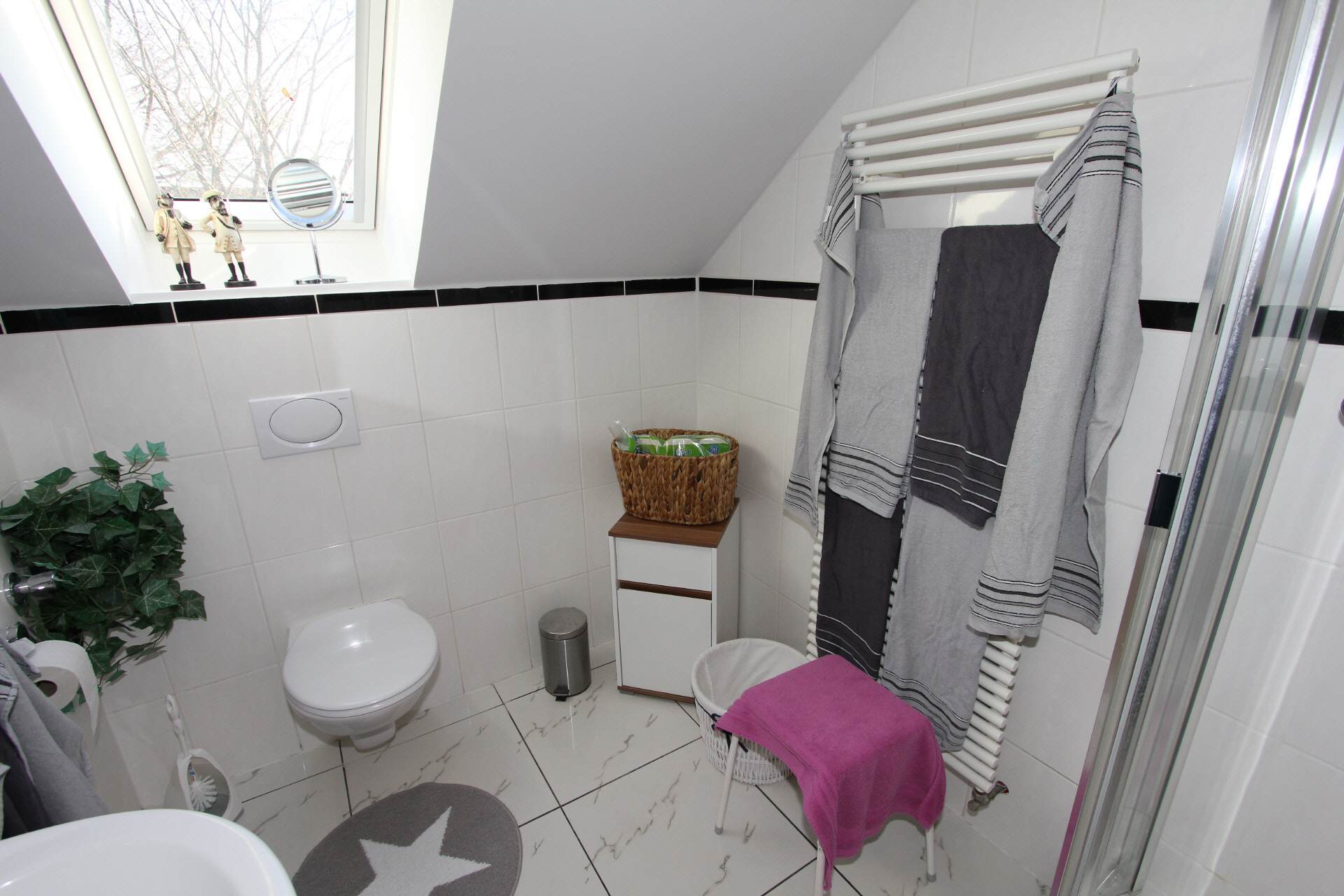 Das Badezimmer verfügt über eine Dusche, sowie ein WC und ein großes Waschbecken. Auch ein kleiner Satz Handtücher ist vorhanden. Durch das vorhandene Fenster ist Tageslicht und die Möglichkeit zur Lüftung vorhanden.