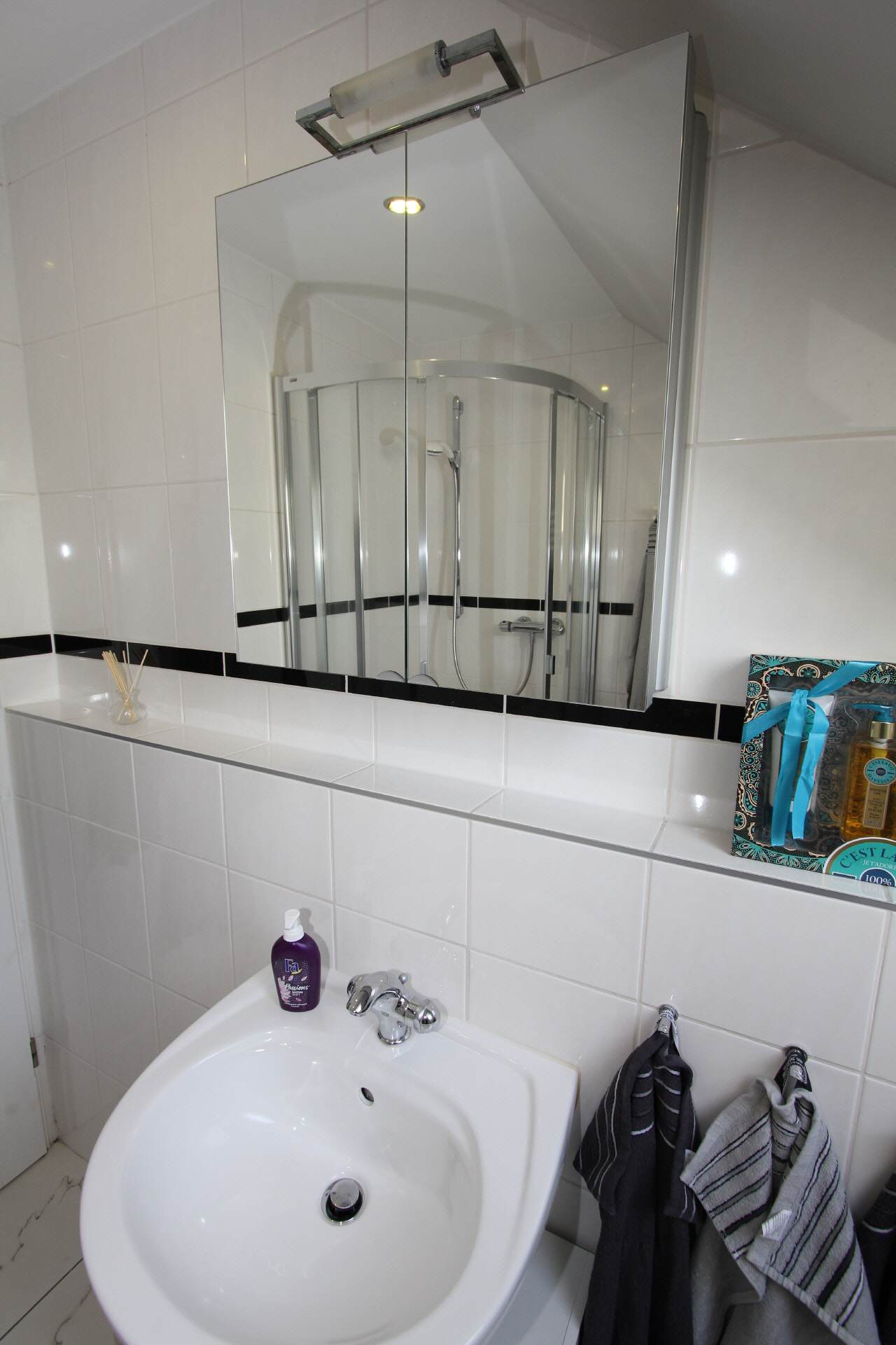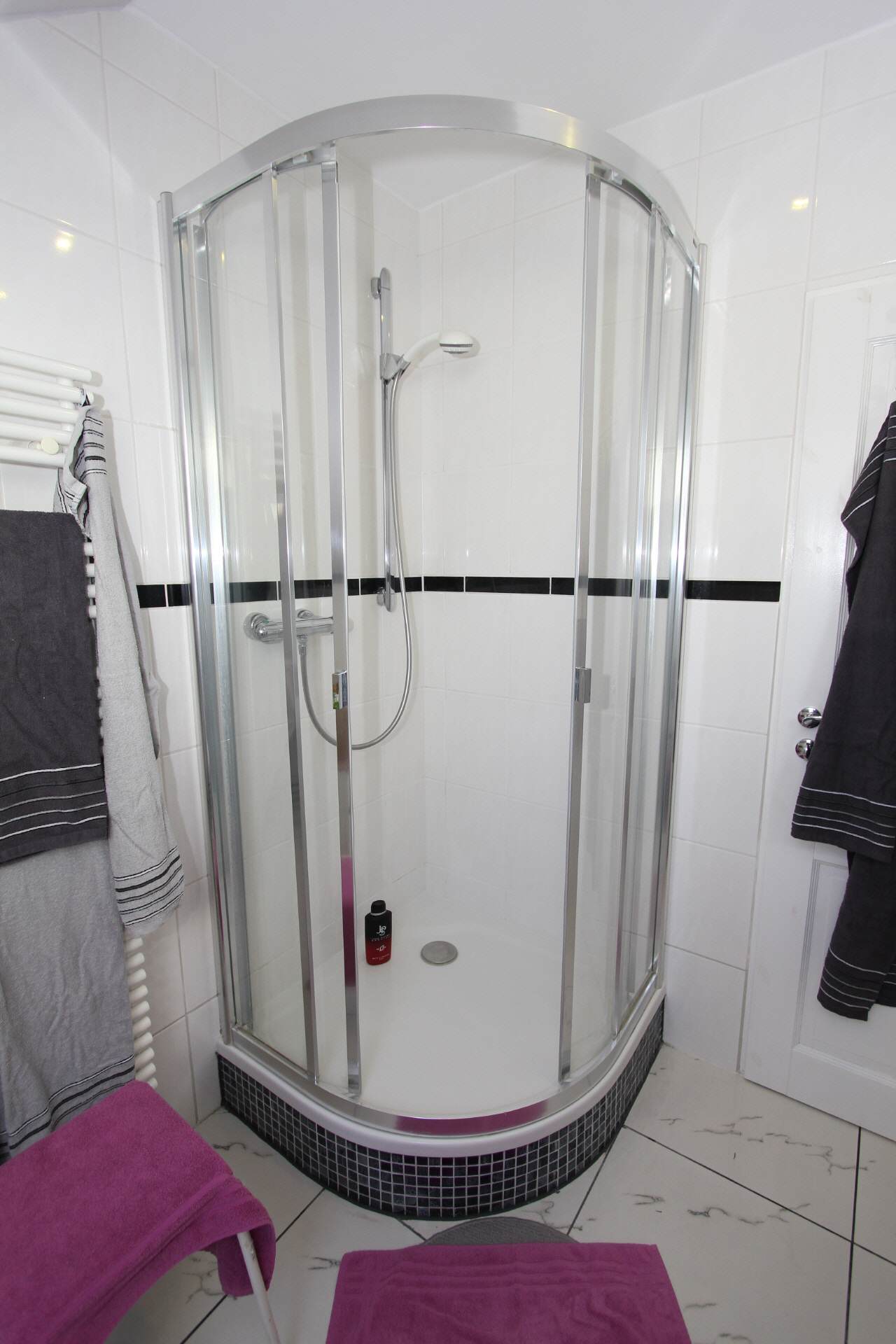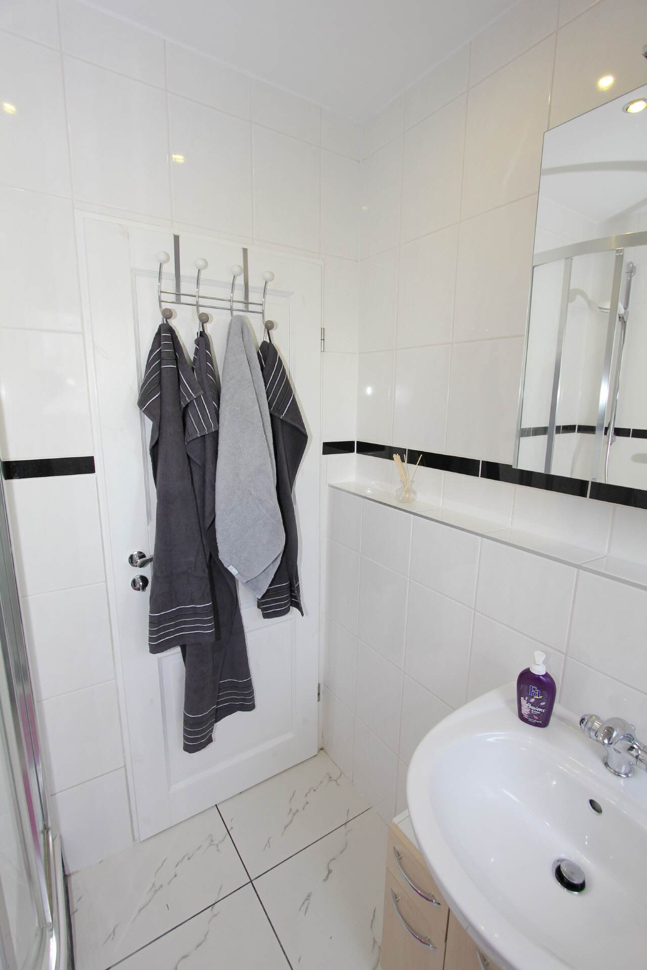 Das Badezimmer verfügt über eine Dusche, sowie ein WC und ein großes Waschbecken. Auch ein kleiner Satz Handtücher ist vorhanden. Durch das vorhandene Fenster ist Tageslicht und die Möglichkeit zur Lüftung vorhanden.