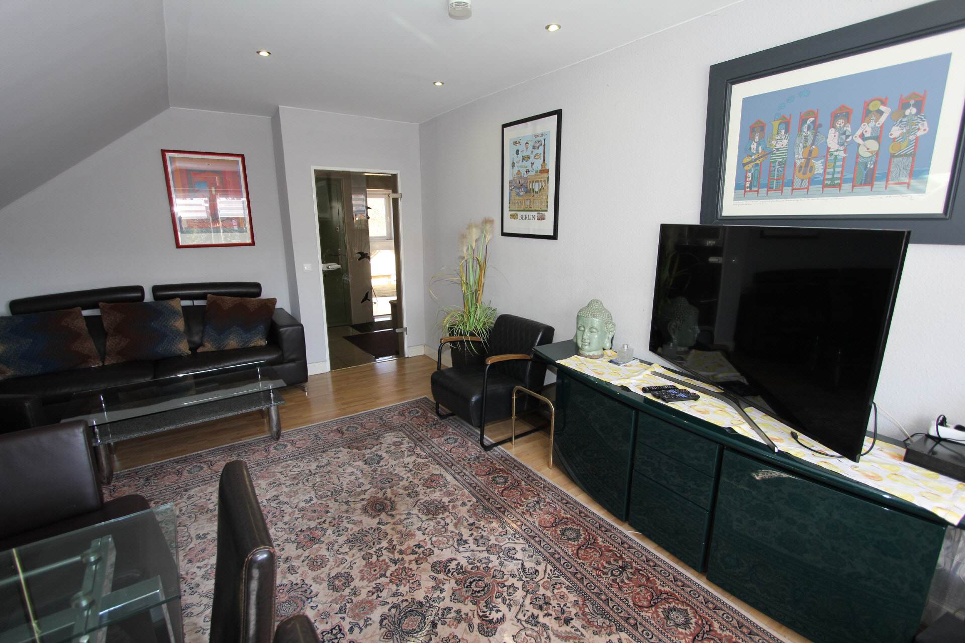 Das Wohnzimmer bzw. der Aufenthaltsraum ist etwa 26 qm groß und gemütlich und exklusiv ausgestattet. Hier findet sich eine gemütliche Sofa-Sitzecke, eine Essecke mit sechs Sitzgelegenheiten. Für Ihre Unterhaltung sorgt ein großer LCD-Fernseher sowie eine Stereo-Anlage.