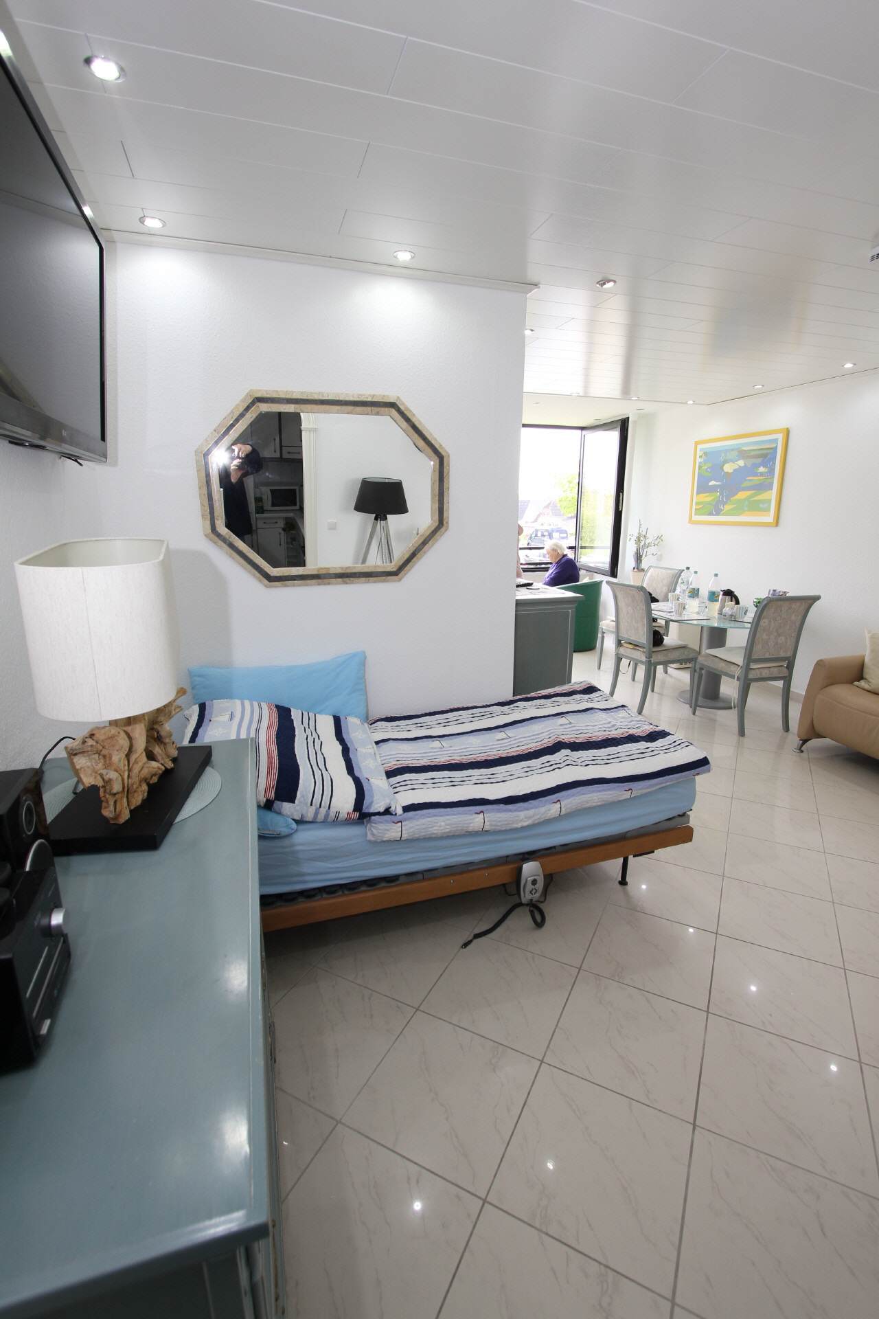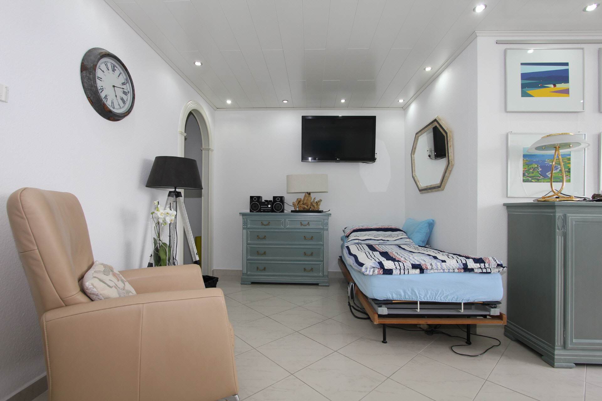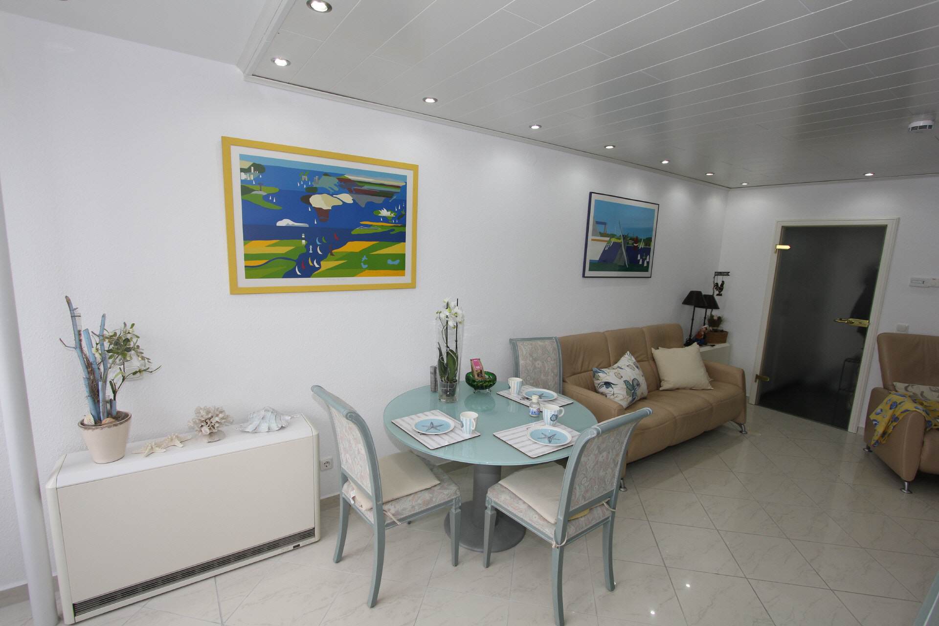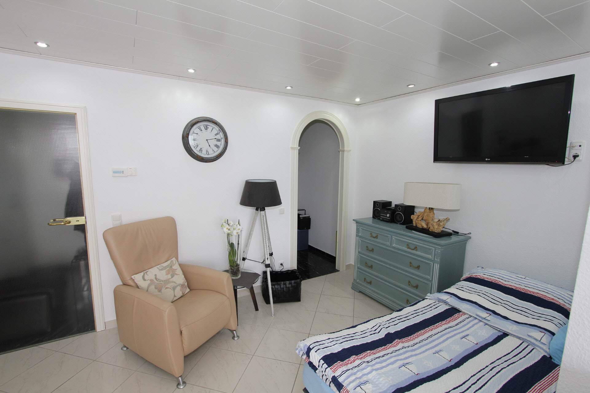 Das Wohnzimmer bzw. der Aufenthaltsraum ist etwa 30 qm groß. Hier befindet sich eine gemütliche Sofa-Sitzecke sowie ein Esstisch mit sechs Stühlen. Für Ihre Unterhaltung sorgt ein großer LCD-Fernseher und eine Stereoanlage und ein DVD-Player.
