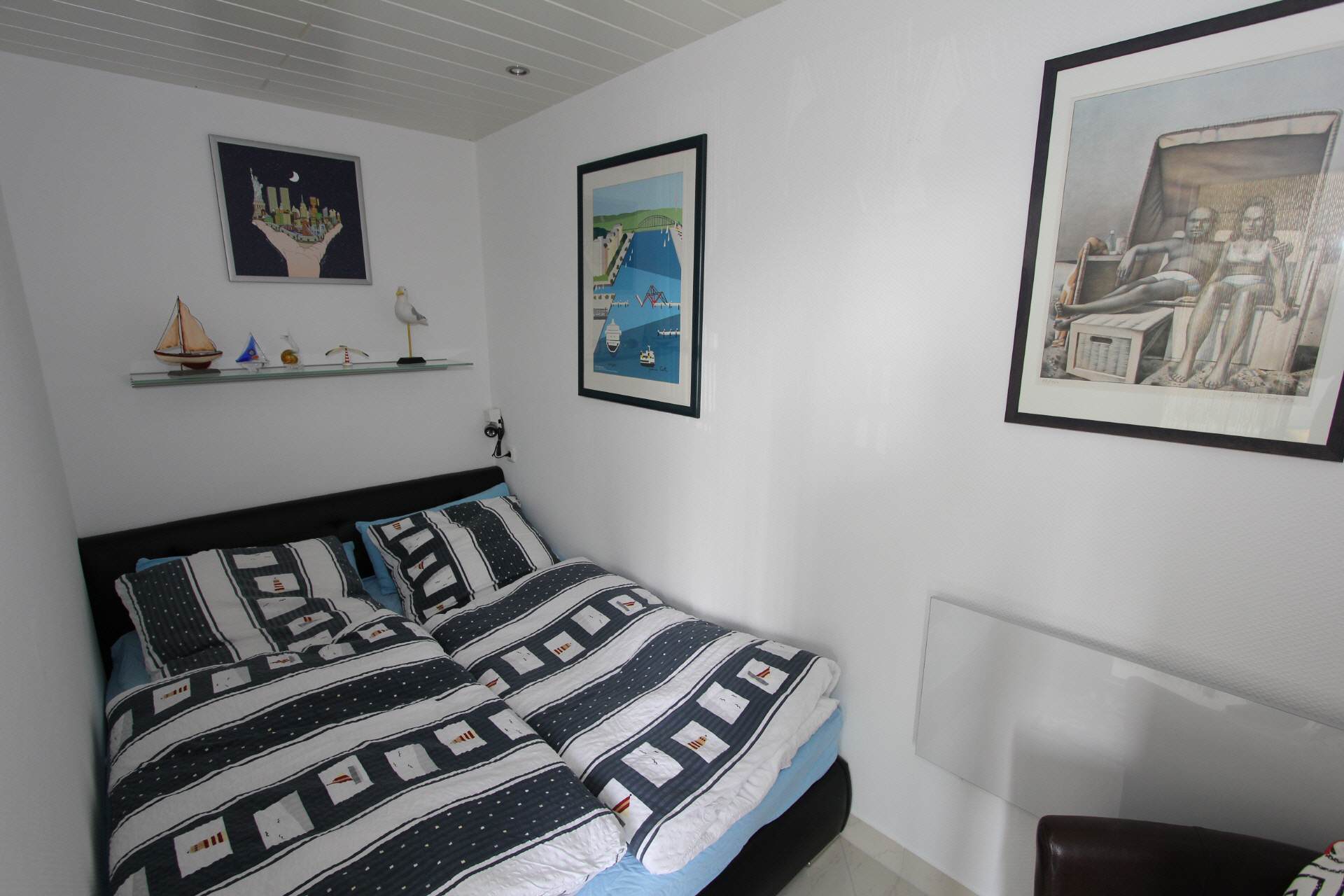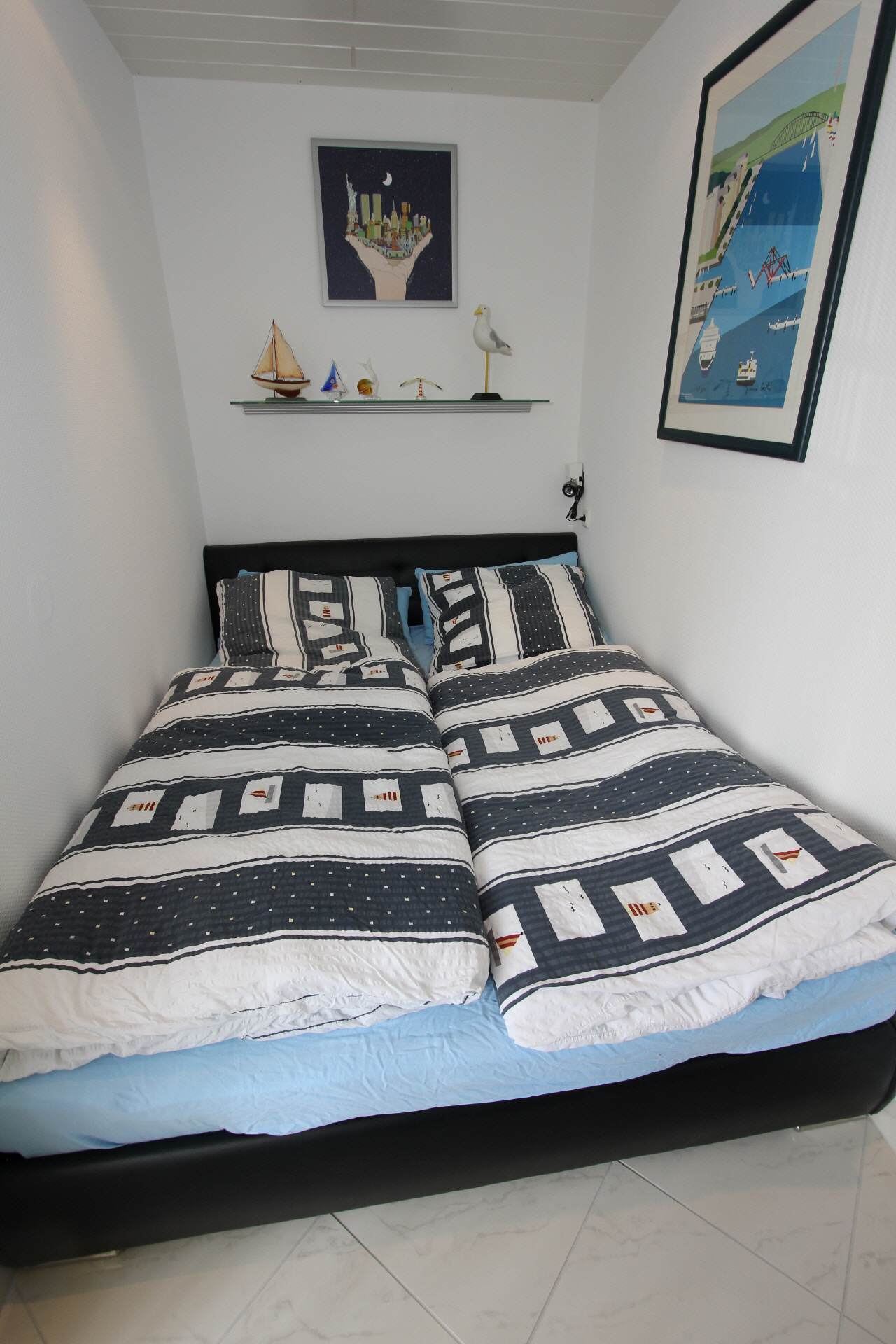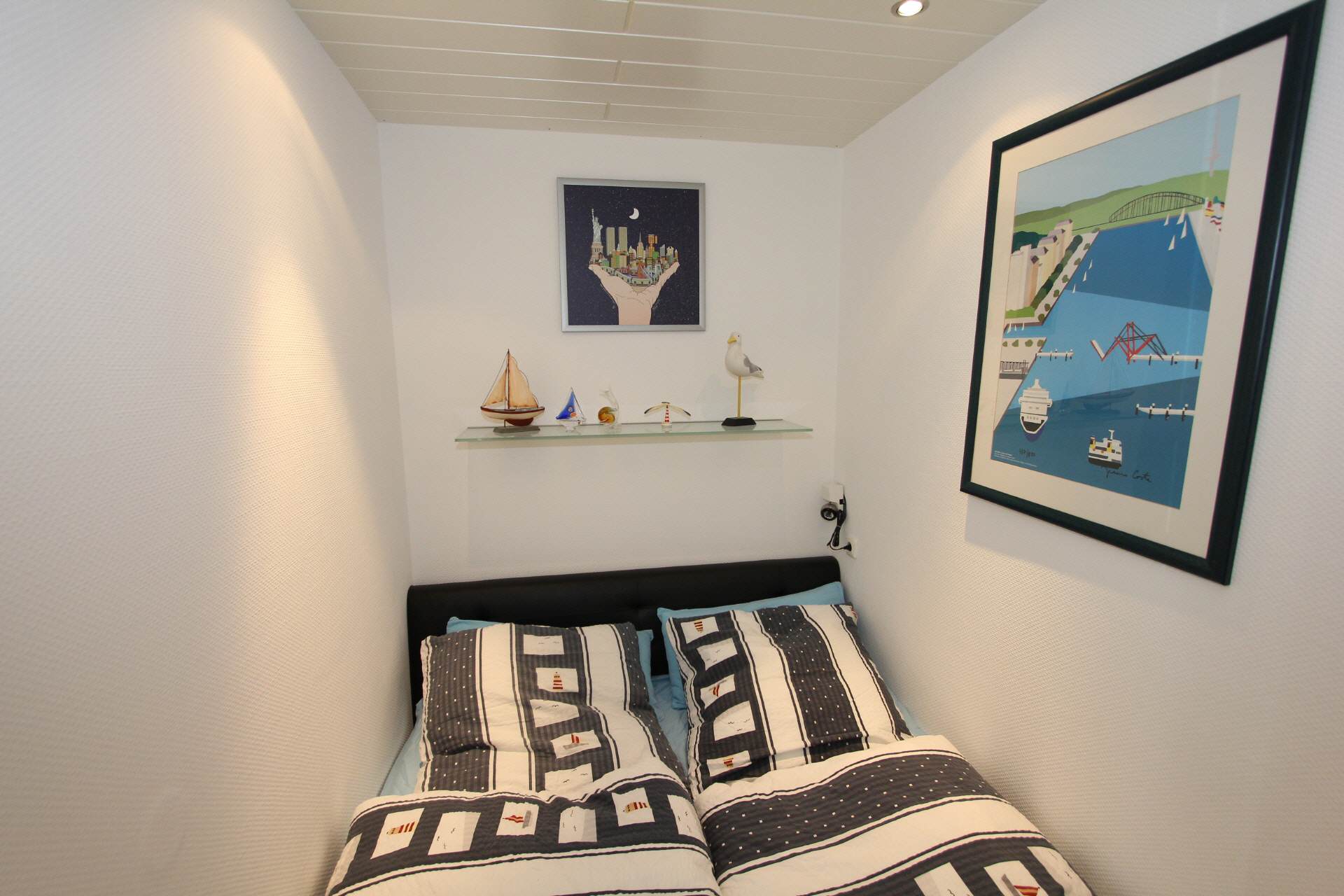 Im gemütlichen Schlafzimmer befindet sich ein Doppelbett, eine Ablage für Bücher und ähnliches und eine Sitzgelegenheit bzw. eine Ablagemöglichkeit.