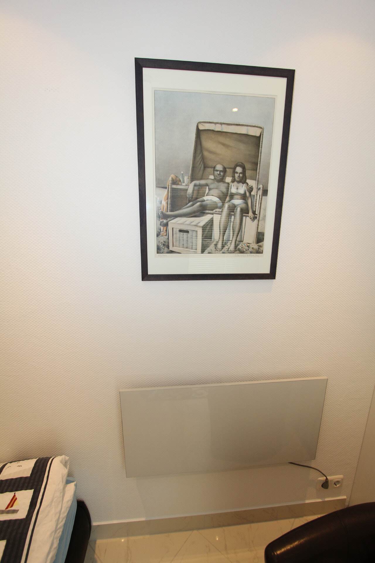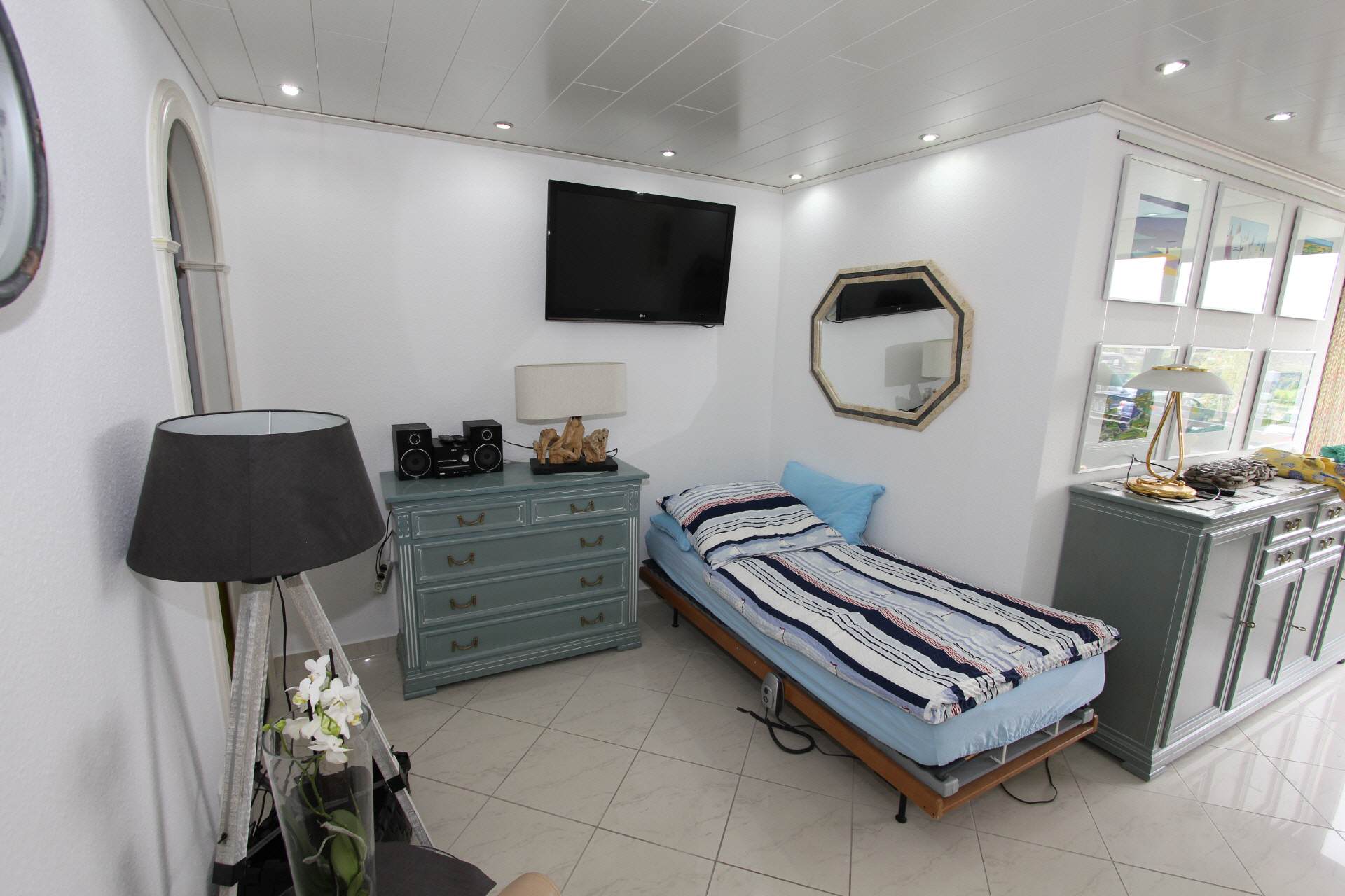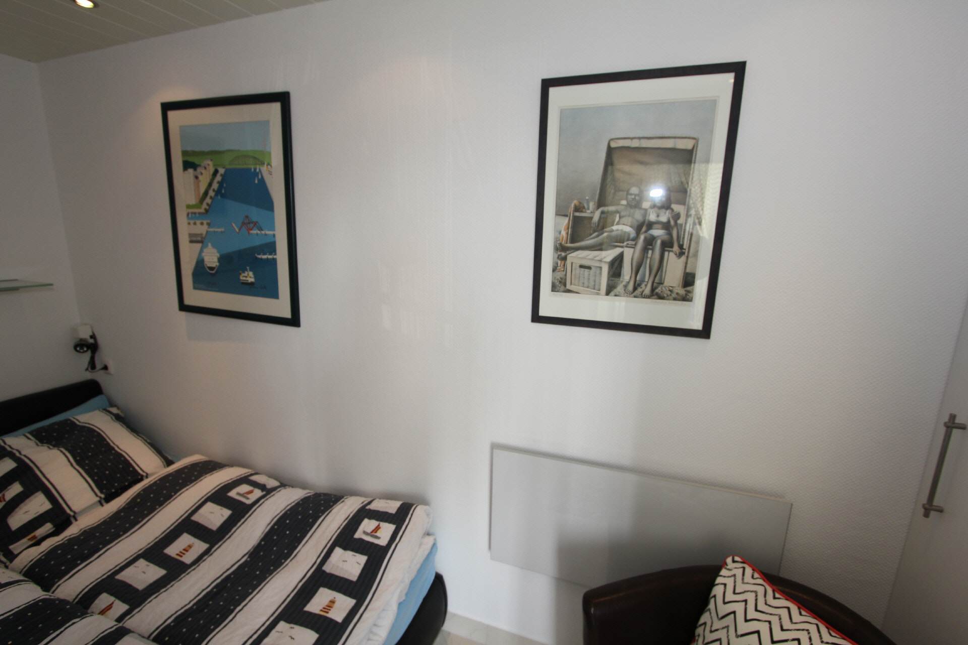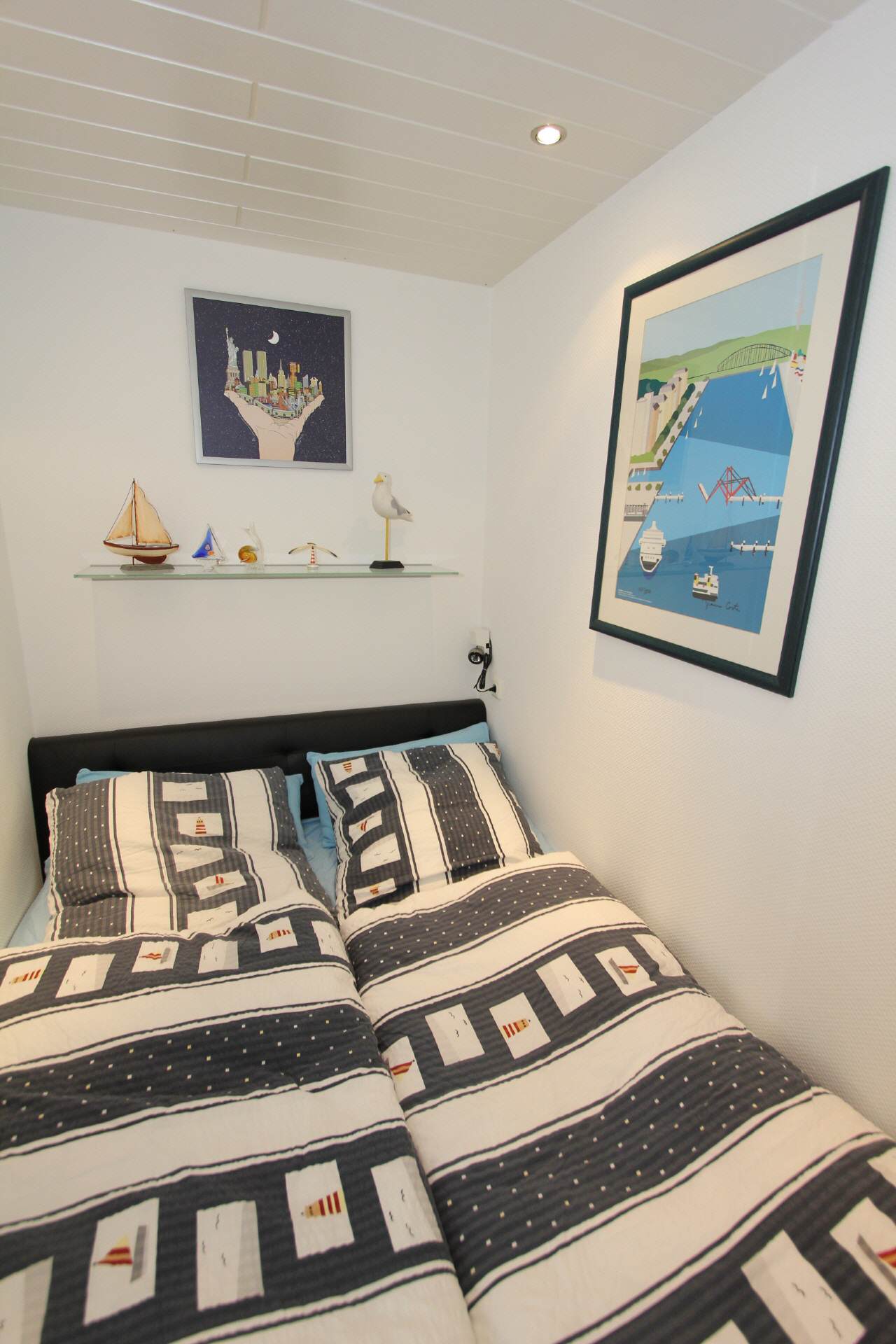 Im gemütlichen Schlafzimmer befindet sich ein Doppelbett, eine Ablage für Bücher und ähnliches und eine Sitzgelegenheit bzw. eine Ablagemöglichkeit.