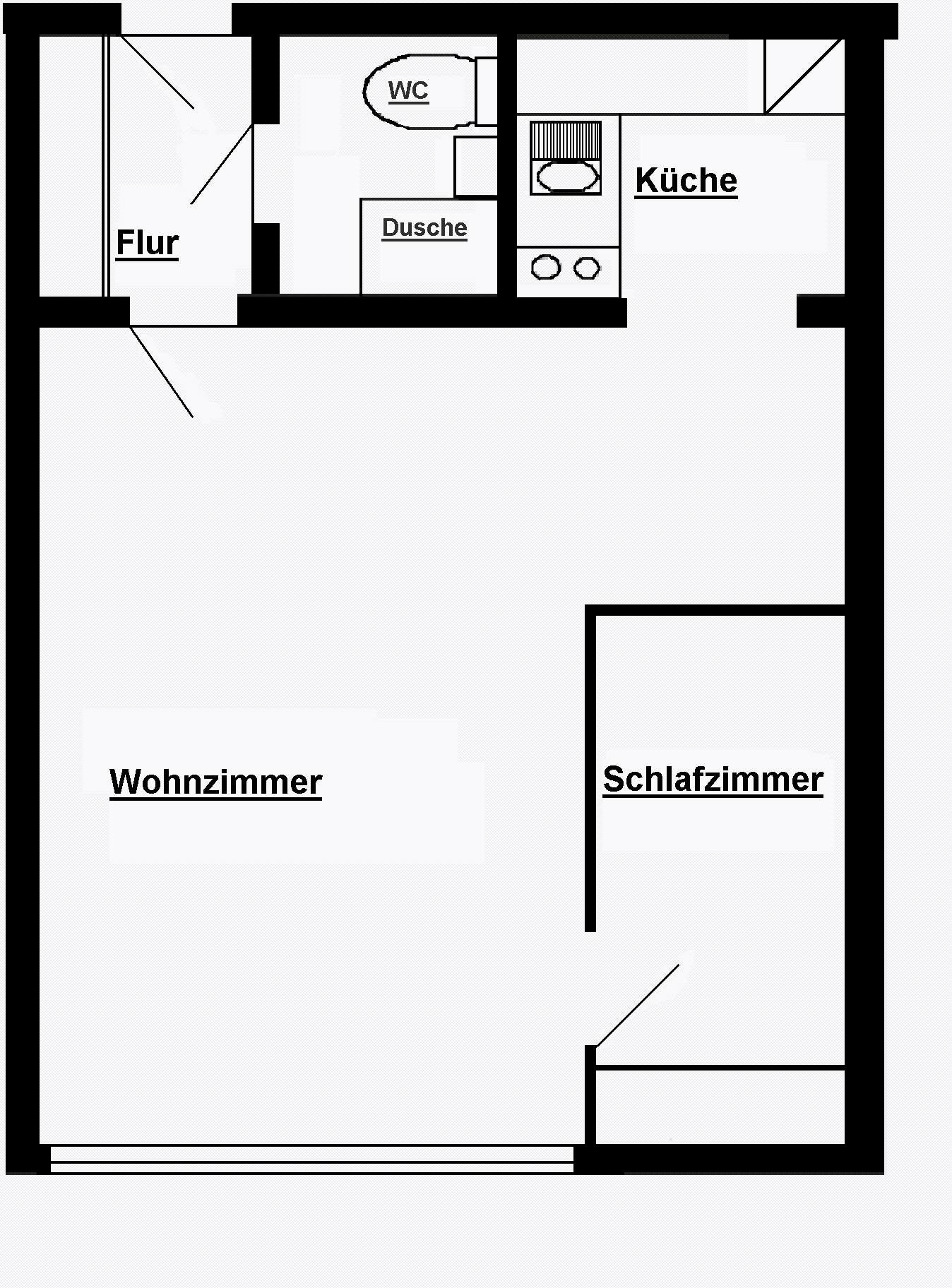 Der Grundriss zeigt die Aufteilung des Apartments in ein großes Wohn- Schlafzimmer, einen Schlafraum, eine Küche, ein Duschbad und einen Flur.