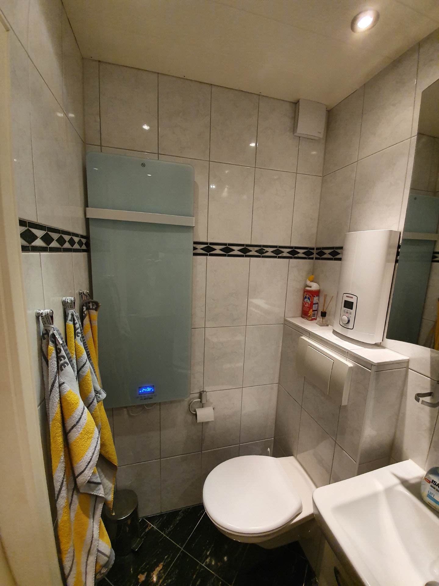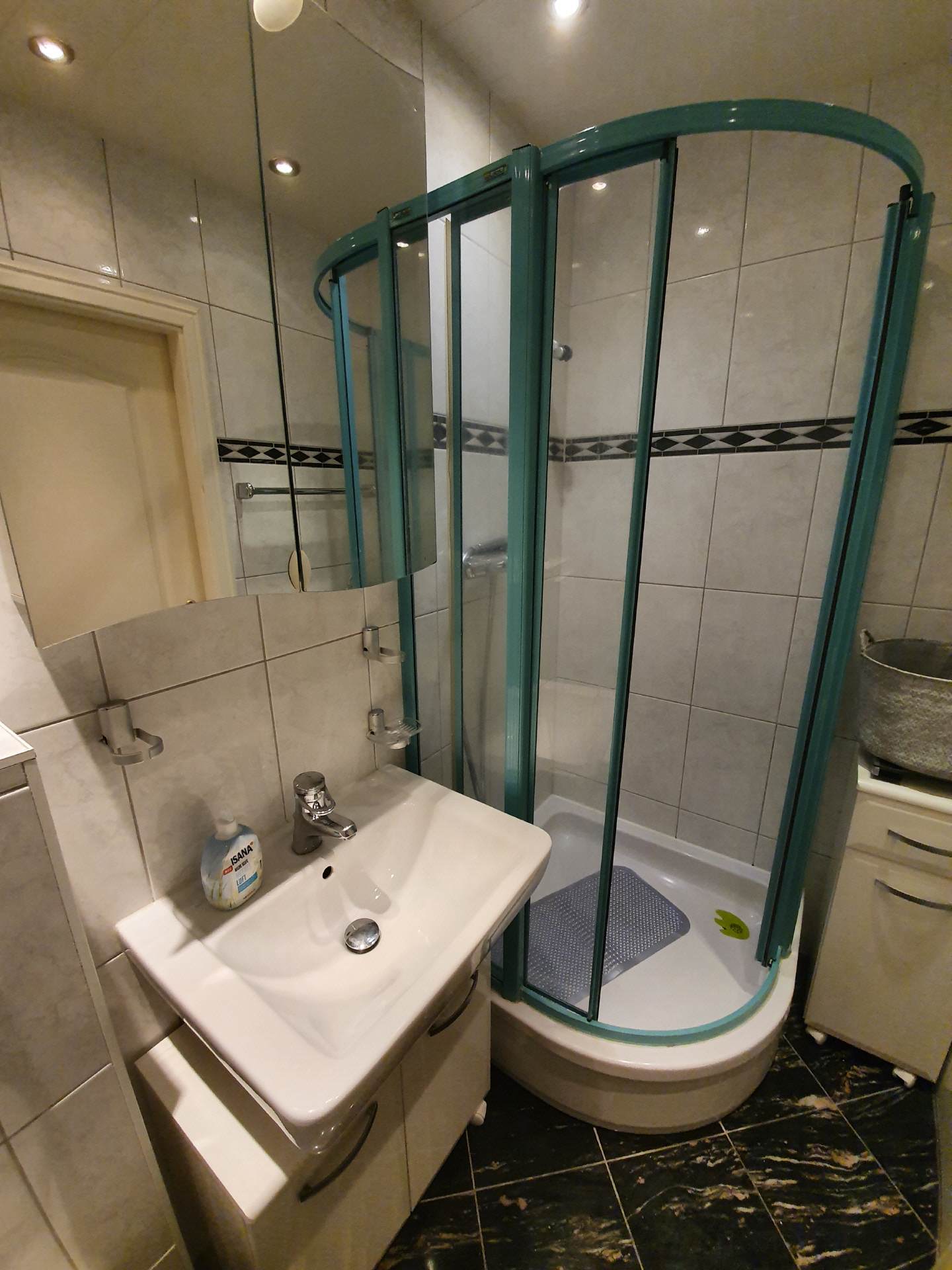 Das Badezimmer verfügt über eine Dusche, sowie ein WC und ein großes Waschbecken. Auch ein kleiner Satz Handtücher ist vorhanden.