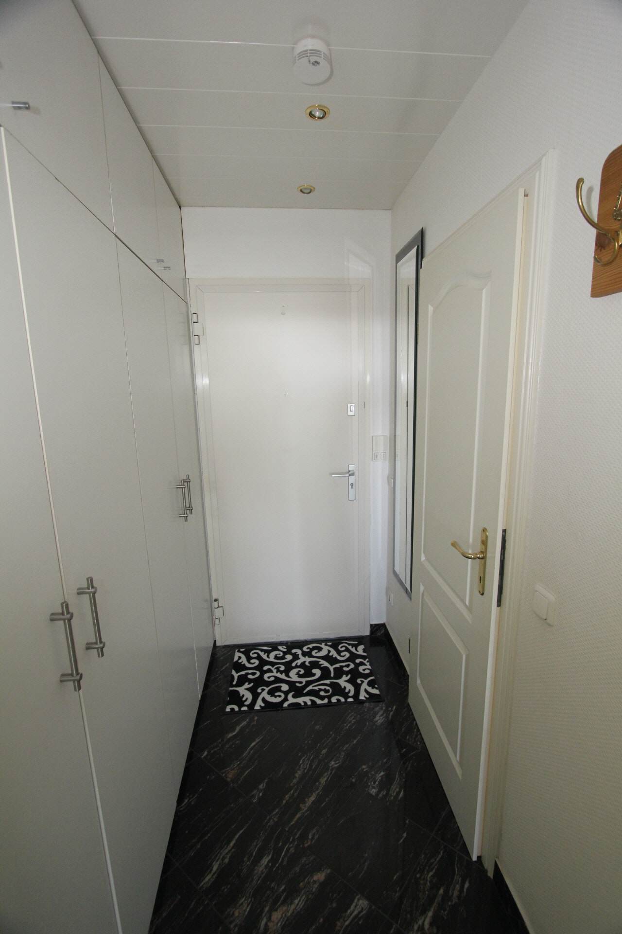 Der Flur ist hell und freundlich mit einem großen Einbauschrank sowie einer Gaderobe ausgestattet. Duschbad und Wohnraum sind von hier aus erreichbar.