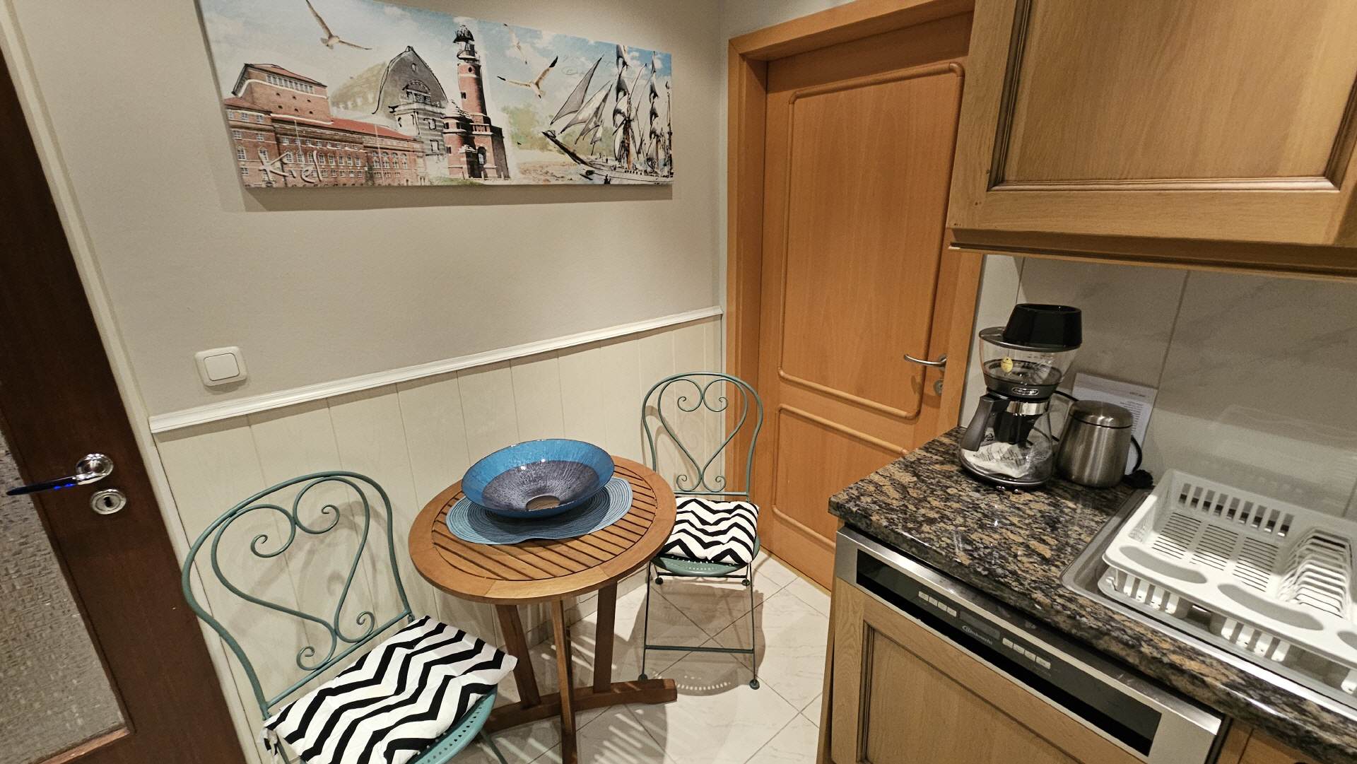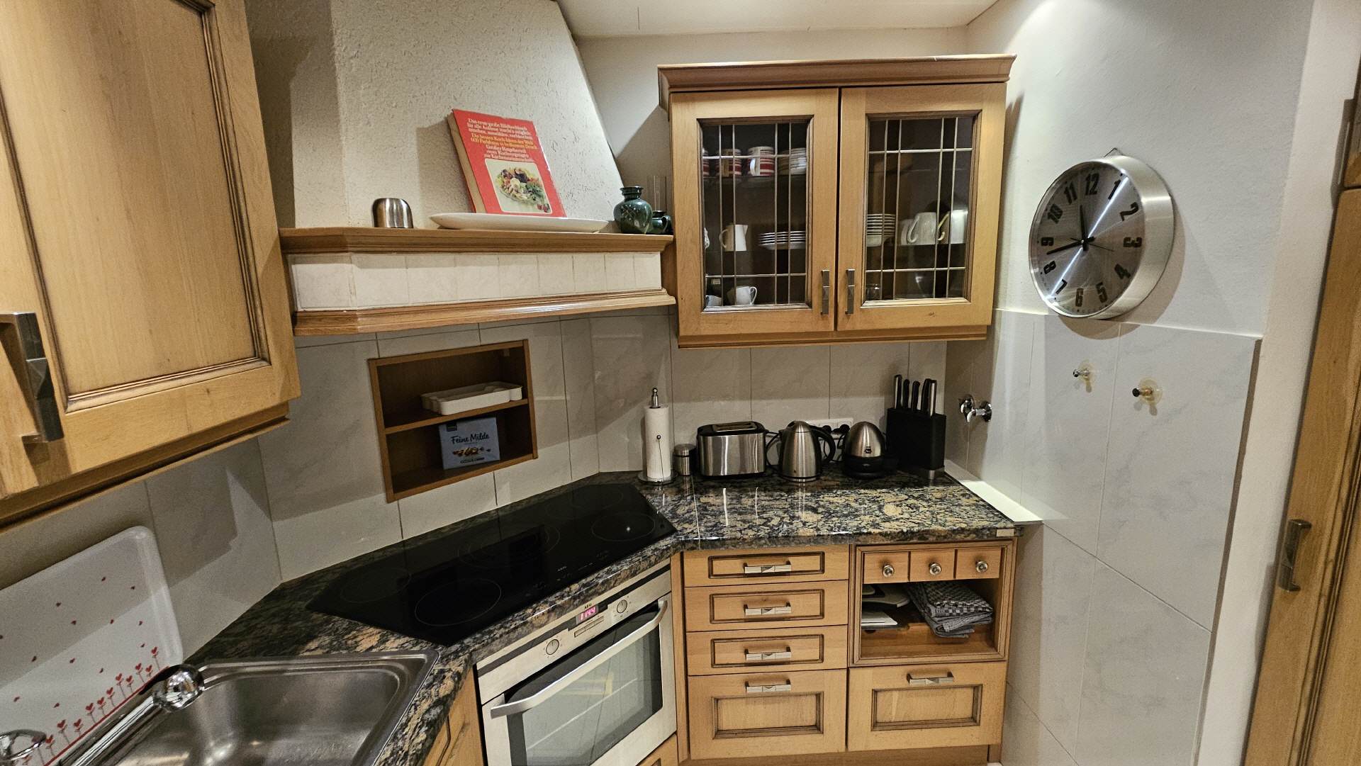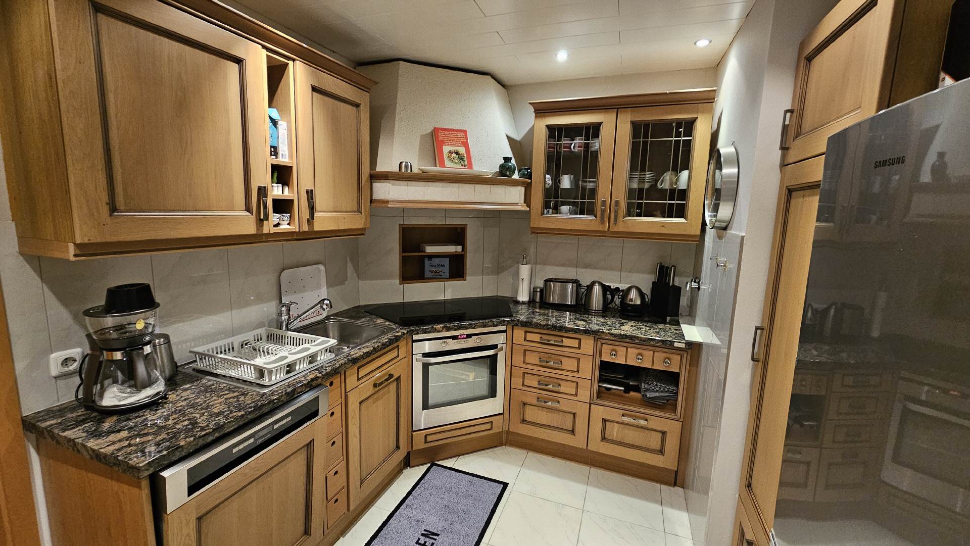 Die sehr geräumige Küche ist vollständig eingerichtet. Ein kleiner Tisch mit zwei Stühlen ist vorhanden. Selbstverständlich gehören ein Toaster, eine Kaffemaschine, eine Spüle, zwei große Kühlschränke, ein Geschirrspüler, ein Elektroherd und ein Mikrowellenherd dazu. Spül- und Geschirrtücher sind ebenfalls vorhanden.