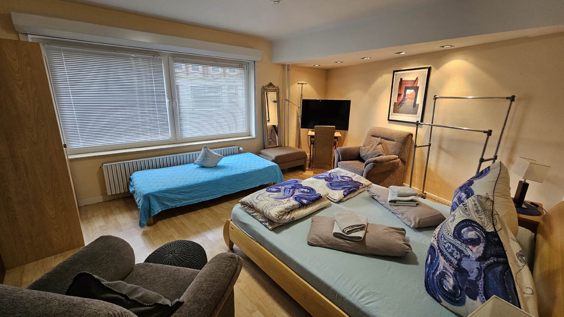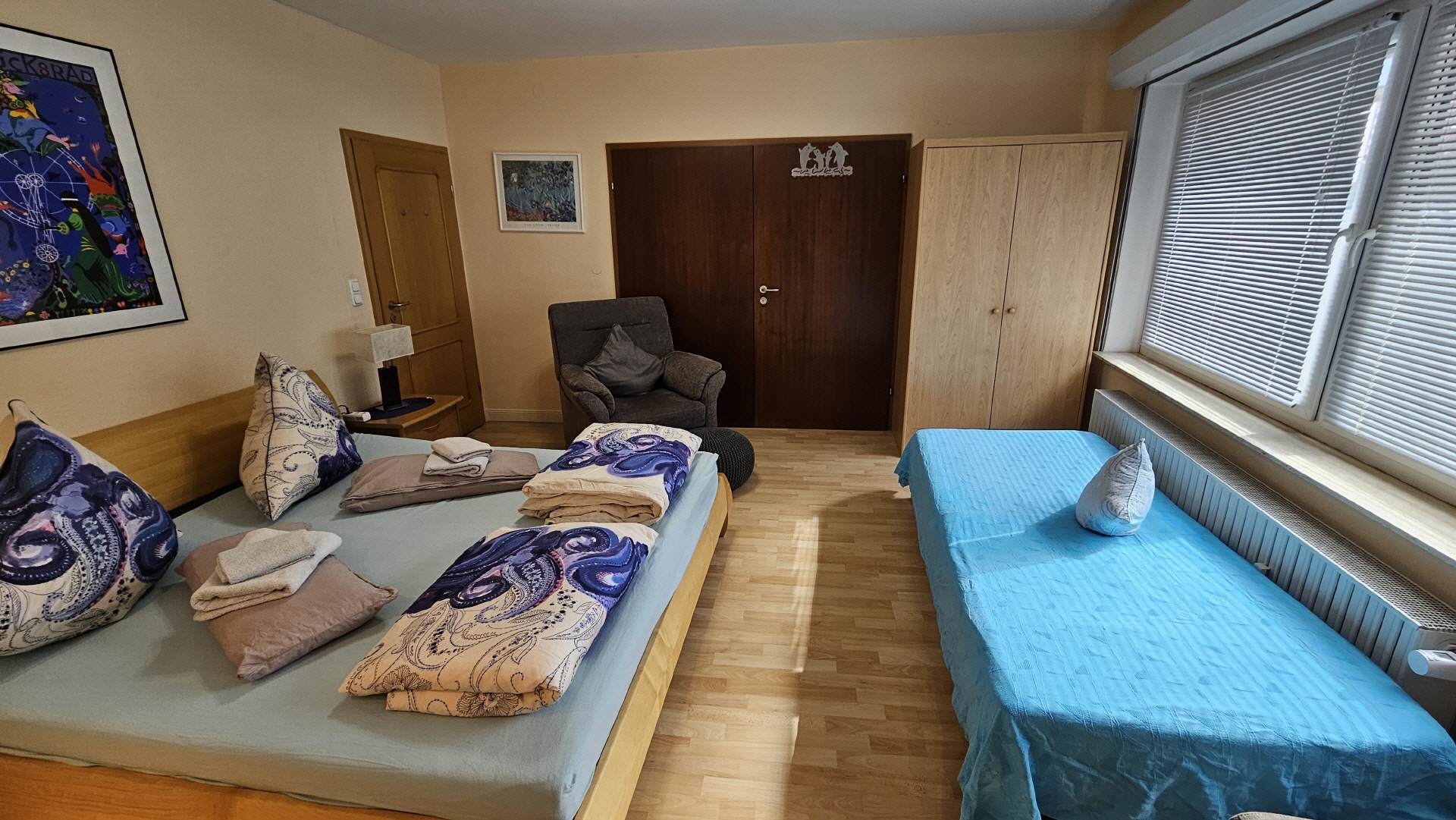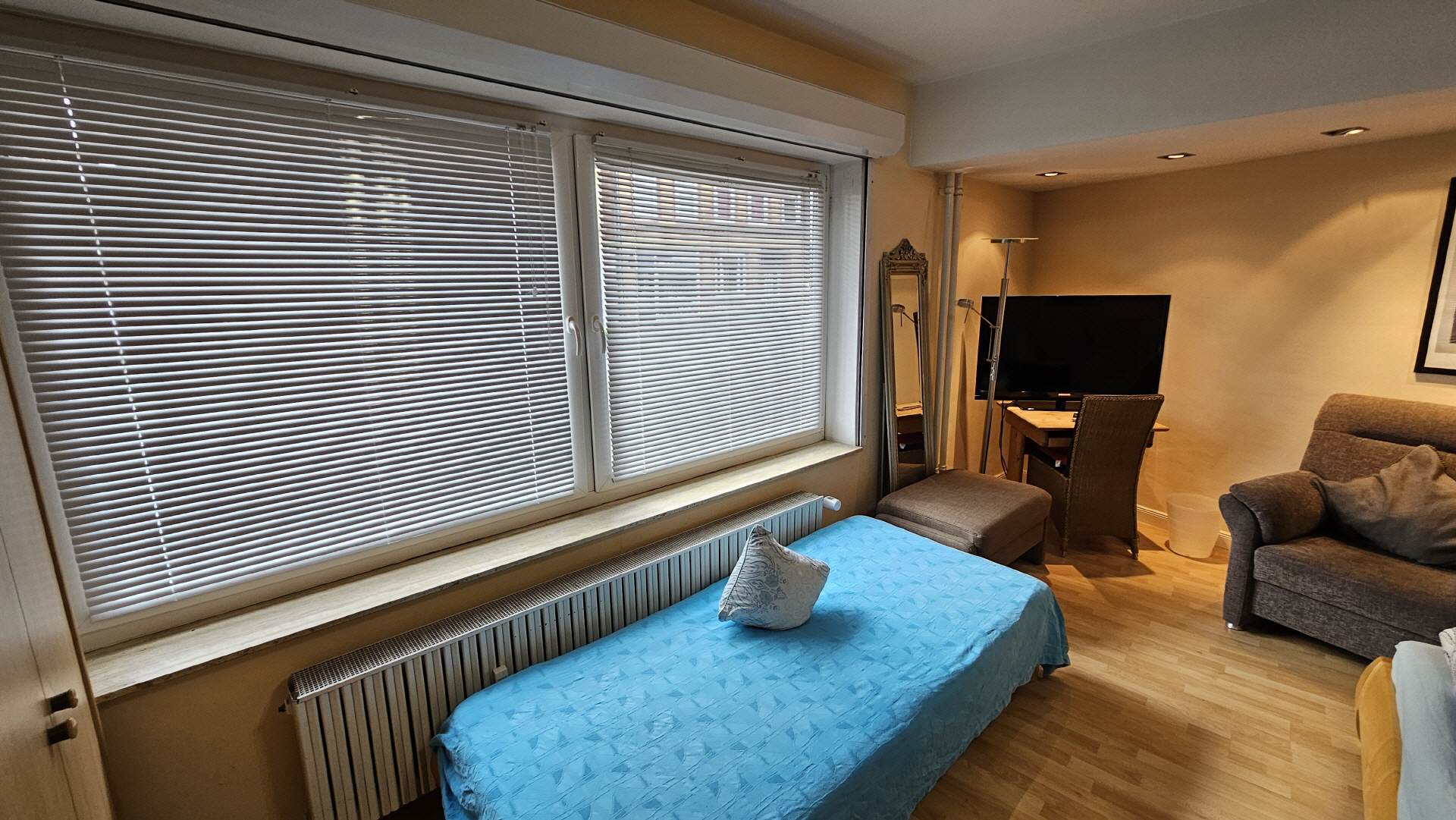 Im Schlafzimmer 1 befinden sich zwei Einzelbetten mit zwei Nachttischen, sowie ein Kleiderschrank. Die Ausstattung wird durch eine Sitzecke mit Leselampe, einem Tisch und einem LCD-Fernseher komplettiert. Ein elektrischer Rolladen sorgt auf Wunsch auch am Tag für Dunkelheit zum Schlafen.