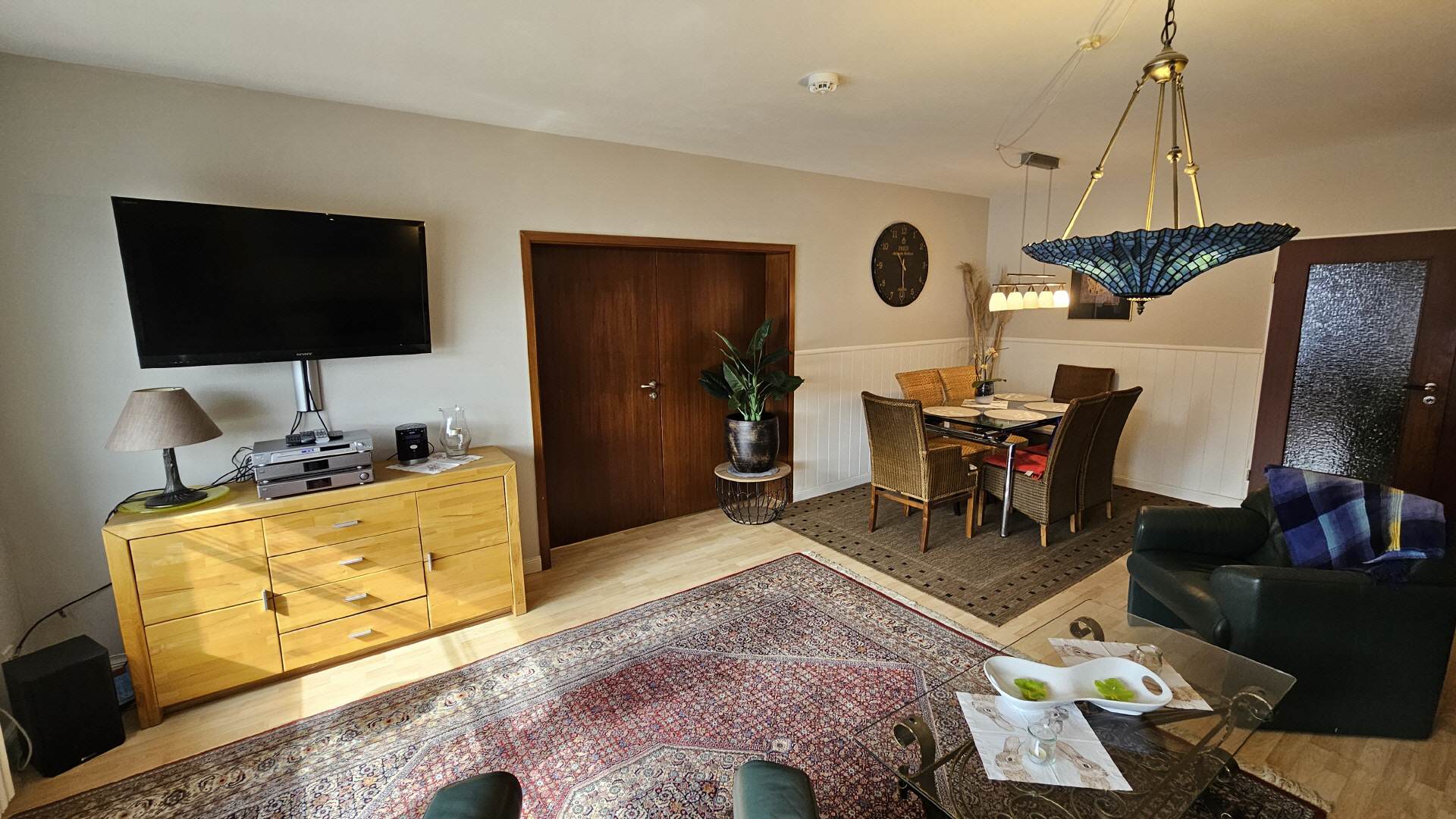 Das Wohnzimmer bzw. der Aufenthaltsraum ist etwa 30 qm groß. Hier befindet sich eine gemütliche Sofa-Sitzecke sowie ein Esstisch mit sechs Stühlen. Für Ihre Unterhaltung sorgt ein großer LCD-Fernseher und eine Stereoanlage und ein DVD-Player.