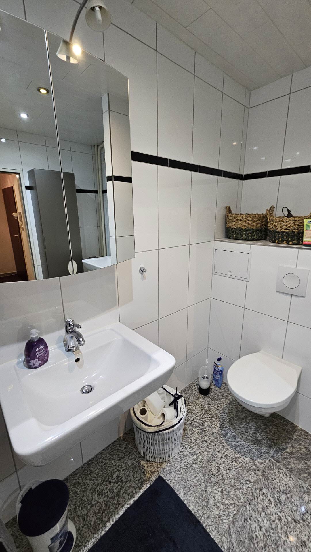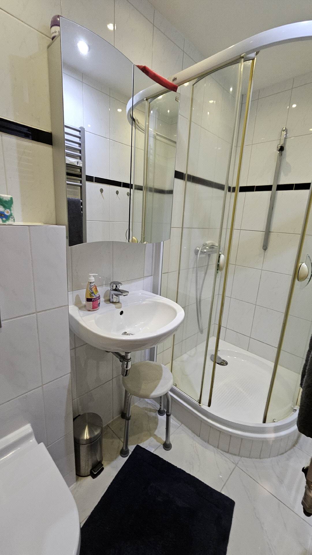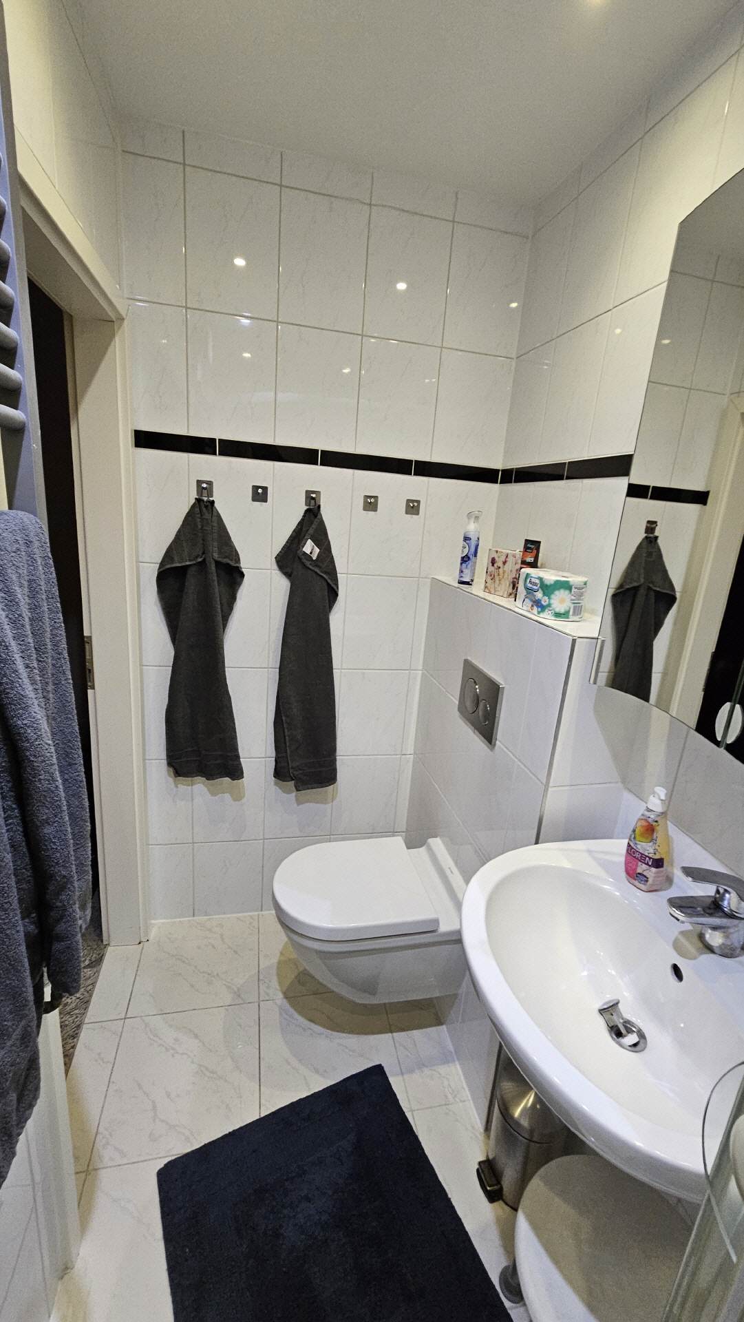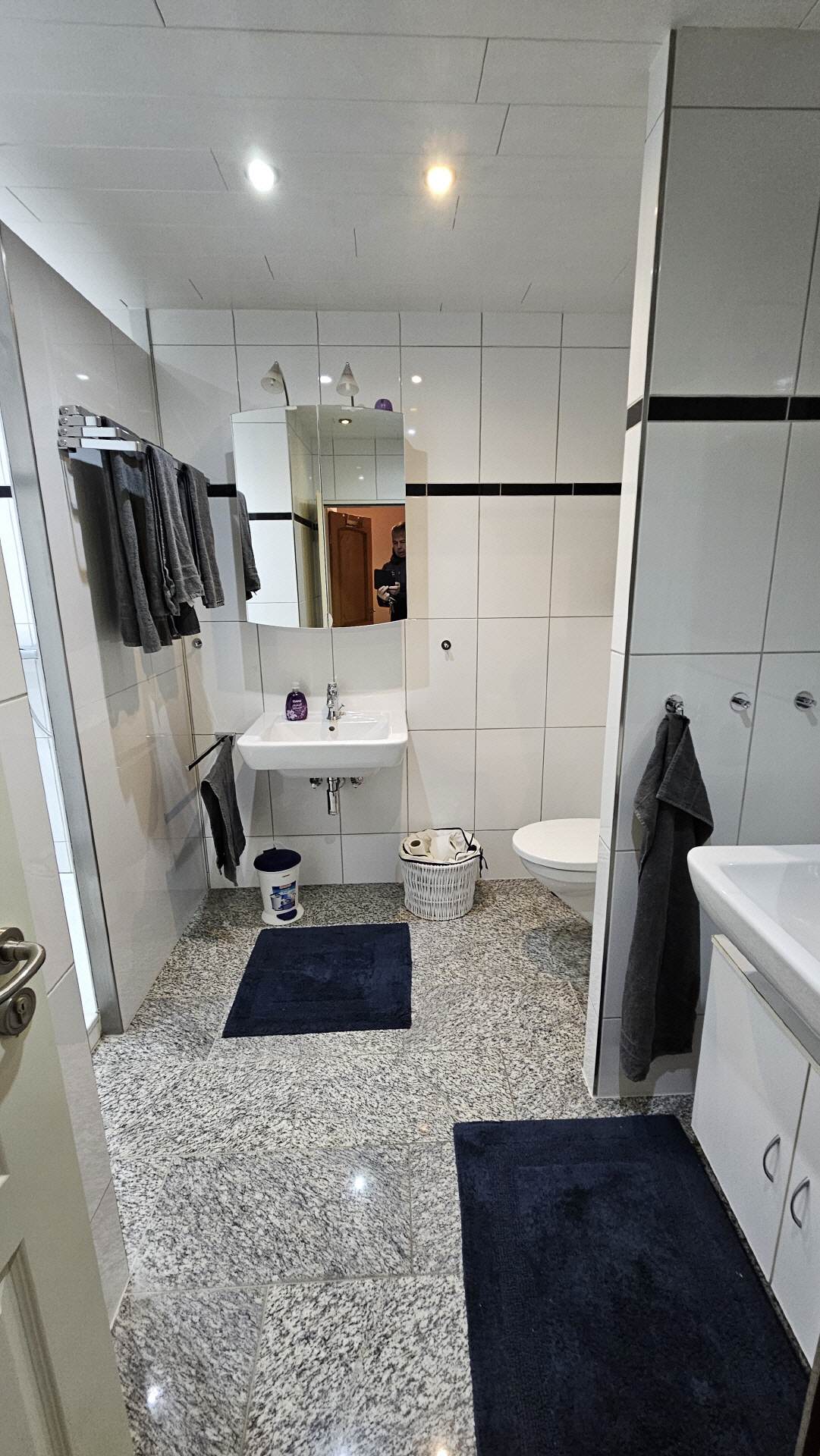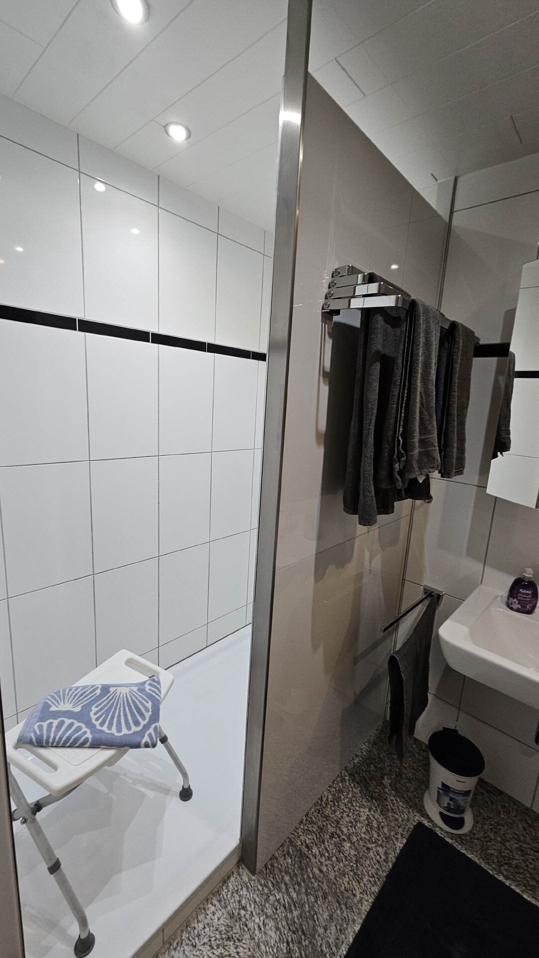 Das Badezimmer 2 verfügt über eine Dusche, sowie ein WC und ein großes Waschbecken. Auch ein kleiner Satz Handtücher ist vorhanden.